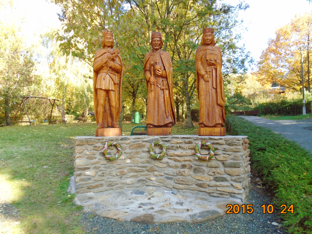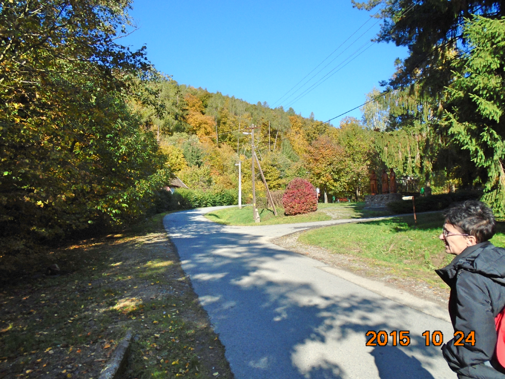 Gyönyörű napsütésben haladunk az őszi színekben pompázó erdőben. A legjobb időpontot választottuk az ide látogatáshoz. Elmegyünk három fából faragott királyi szobor mellett.