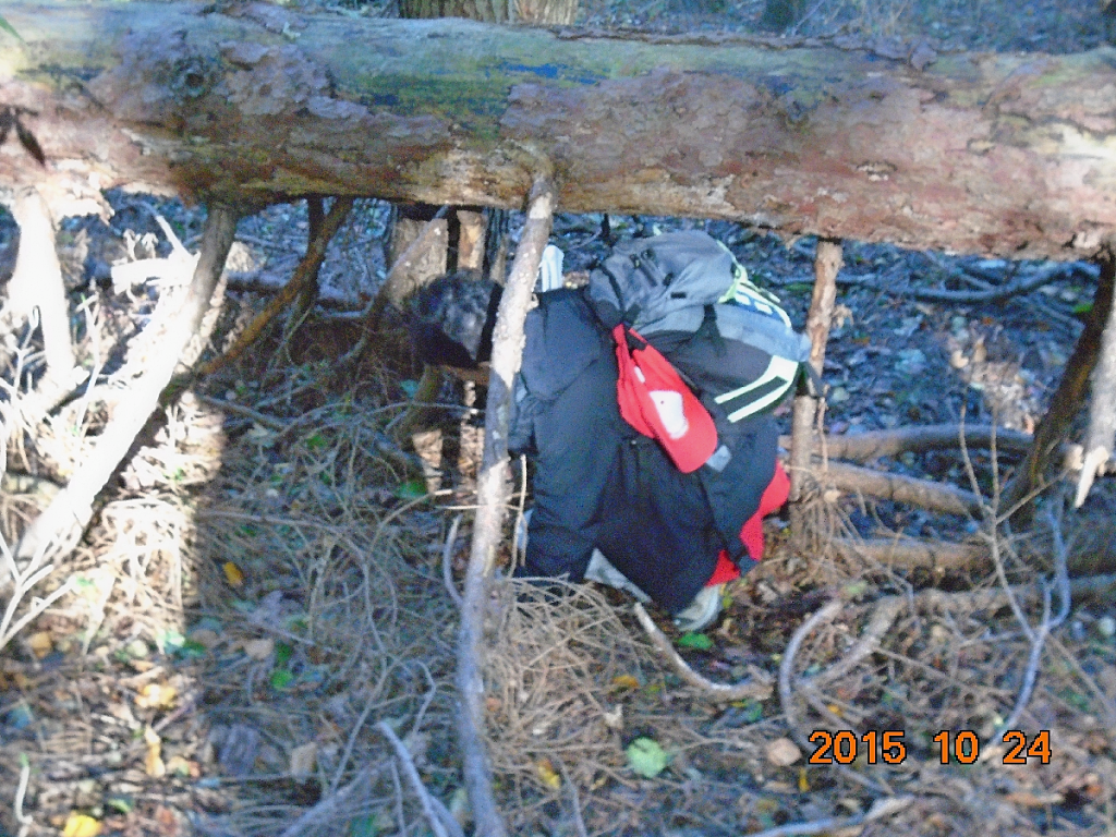 Itt merőlegesen vágunk neki a hegynek, közvetlenül megcélozva a ládát. Kidőlt fák alatt bújunk át és leszakadt ágak között lépdelünk a meredek terepen. Igazi akadálypálya, én élvezem. Egyszer csak Vé kiáltását hallom, amivel magához invitál, ugyanis a lába becsúszott két ág közzé, míg a feje felett egy kidőlt fa fekszik keresztben. Sehogy nem tud a szorult helyzetéből szabadulni. Nevetésre ingerlő látvány a foglyul ejtett Vé, de igyekszem komoly megmentő látszatát kelteni és legelőször is lefényképezem a szituációt, mert fontos a történések dokumentálása.