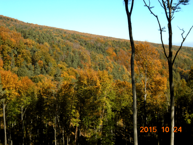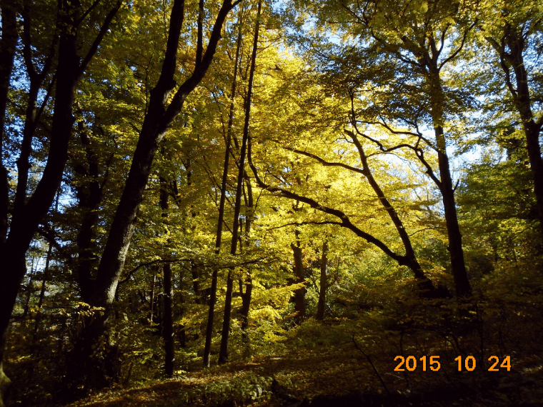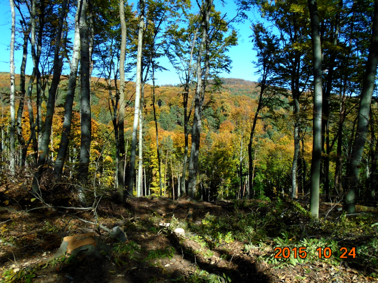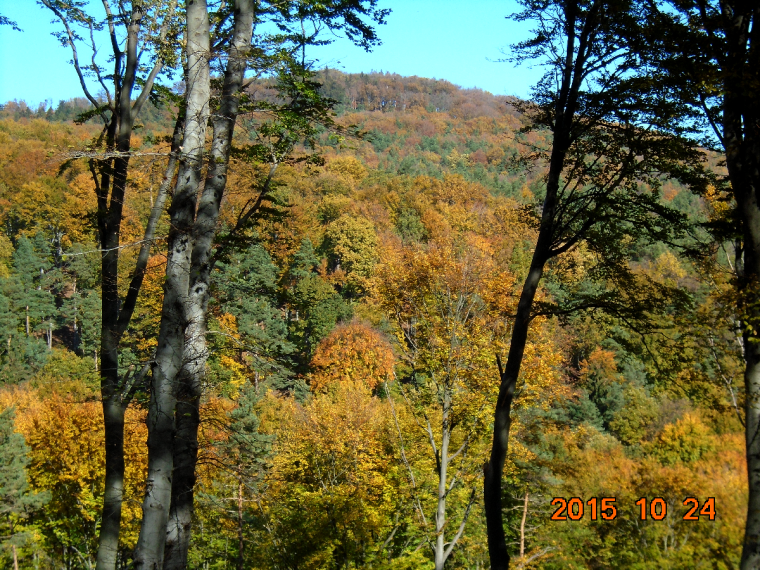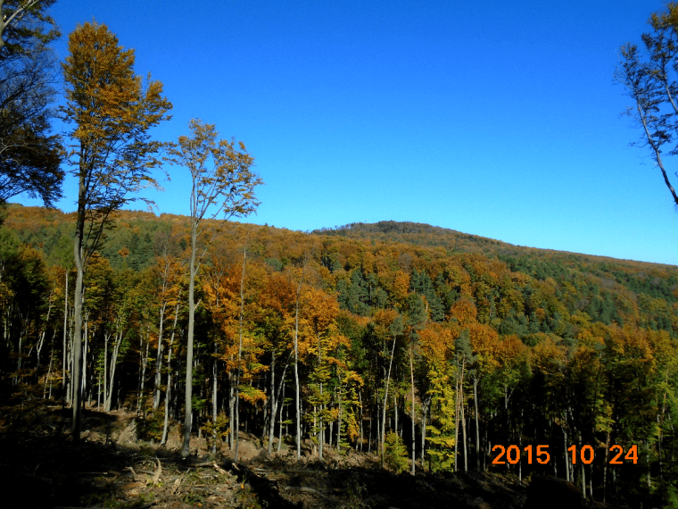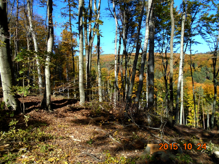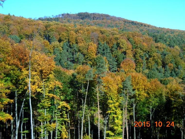 Ennek a TB-nek a rendeltetése, bejárni a világ hegyeit, ezért ezt a ládát alkalmasnak találjuk arra, hogy elhelyezzük benne. Sajnos Magyarországon, a hazai honlapon játszó kesserek közül sokan nem ismerik az utazó ügynökökhöz kapcsolódó szabályokat és ajándéknak nézik azokat. Csak remélni tudjuk, hogy egy osztrák ládász kezébe kerül, aki kiviszi az országból és tudja mi a teendő a kis utazóval. Logolás után a ládát gondosan betakargatjuk. Elég feltűnő az ágkupac, de itt valószínűleg nem nagyon járnak nem ládász emberek. A fák közzé besütő nap okozta látványnak nem tudok ellenállni, gyorsan lövök egy fényképet a sárgaruhás fákról.
