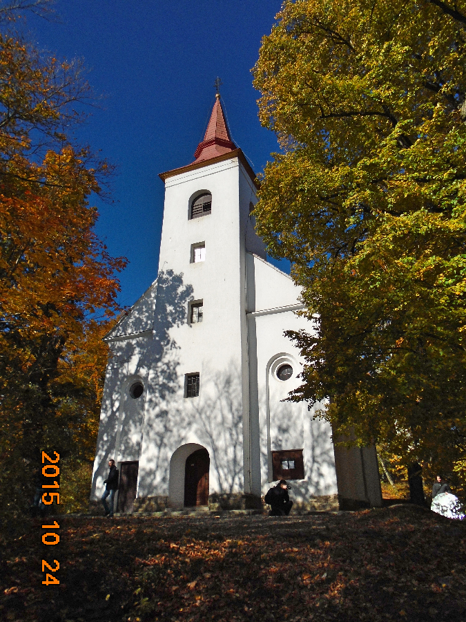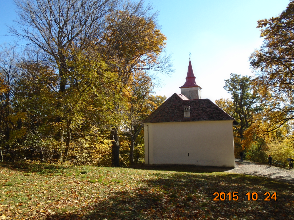 Még egy nekirugaszkodás, hogy az előttünk magasodó kb. 3 emeletnyi szintkülönbséget leküzdjük és fent is vagyunk. Most látom, jól döntöttünk, hogy alulról próbálkoztunk, mert felüliről csak gatyaféken tudtunk volna leereszkedni az utolsó métereken. Miután kifújtuk magunkat, elindulunk balra, a kápolnához. Hátulról közelítjük meg. A környéke pedig itt is a színpompás, őszi ruhájú fákkal díszített.