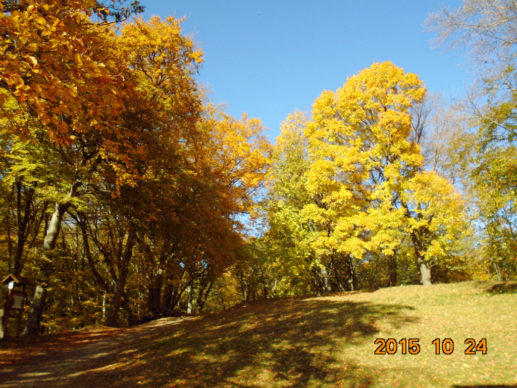 Később sűrűbb erdőben haladunk. Kanyargó, erdei szekérúton haladunk következő célunk, a Jávor-kút felé. A zavartalanul sütő őszi nap játékos fényfoltokat hoz létre a színes falevelek között. Nem győzzük csodálni, milyen művész is tud lenni a természet. Sajnos a fényképezőgép nem képes ezeket a színes villódzásokat reprodukálni. Megérkezünk a Jávor-kúthoz, leolvassuk a jelszórészletet. Be kell vallanom, igazából csak az út mentén elhelyezett tábláját láttuk, mert maga a kút kissé távolabb esik és az oda vezető út tele van ágtörmelékkel. Vé-nek még mindig fáj a bokája, nem akarja megkockáztatni, hogy egy ismételt rossz lépés után, esetleg ne tudjon lábra állni itt, messze a “civilizációtól”.