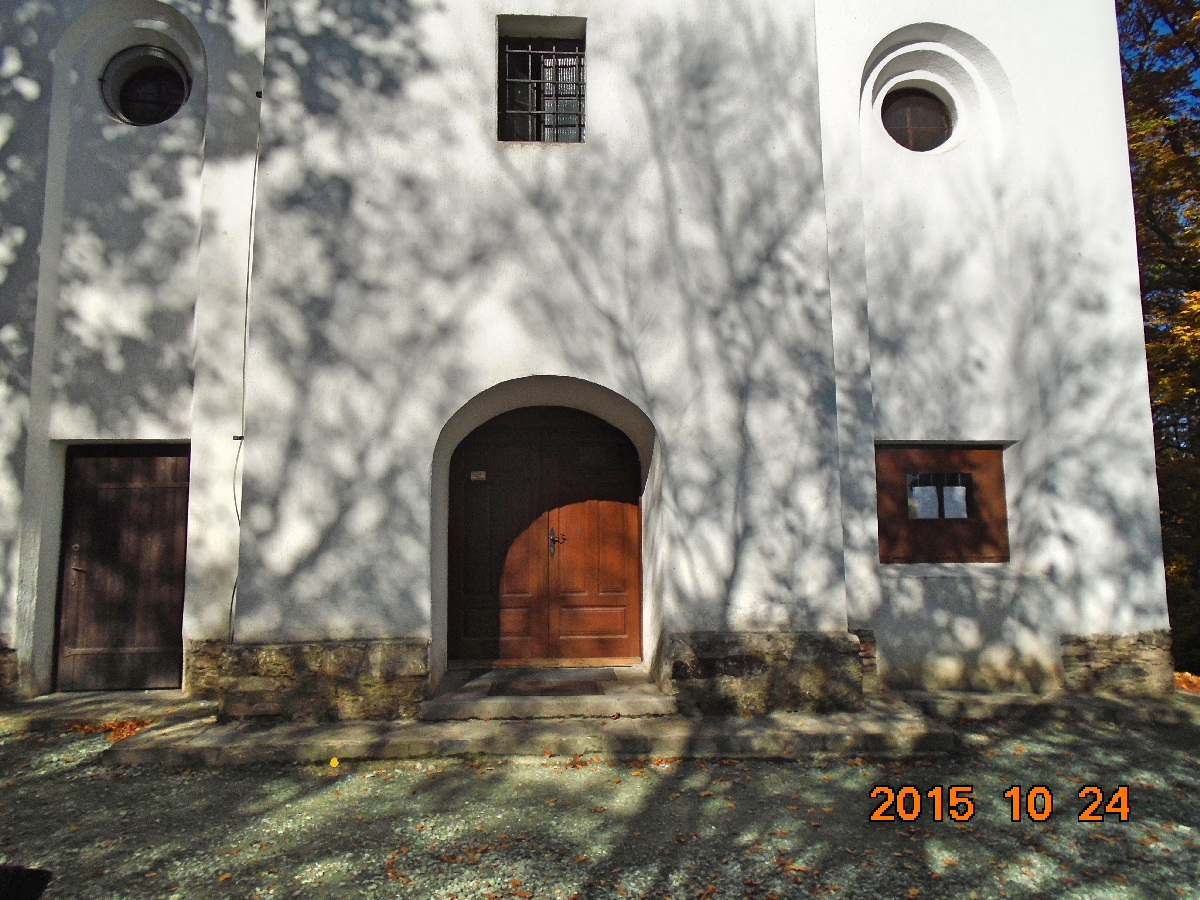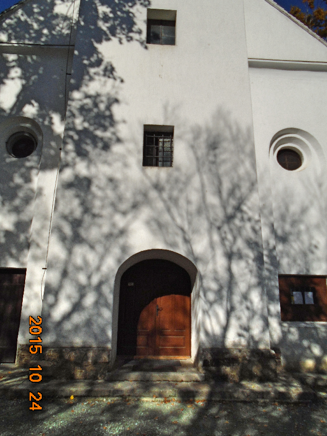 Megkerülve a kápolnát, szemügyre vesszük az elejét is. Sajnos teljes terjedelmében lefényképezni nem nagyon lehet, mert előtte igen szűk a rendelkezésre álló tér. Így csak részlet fotók készülnek. Végül találok egy pontot, ahonnan az egész épület belefér az objektív látómezőjébe.