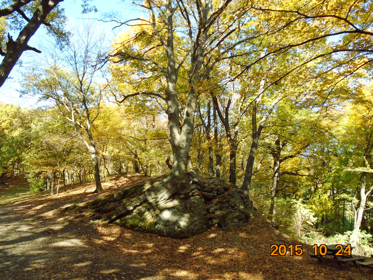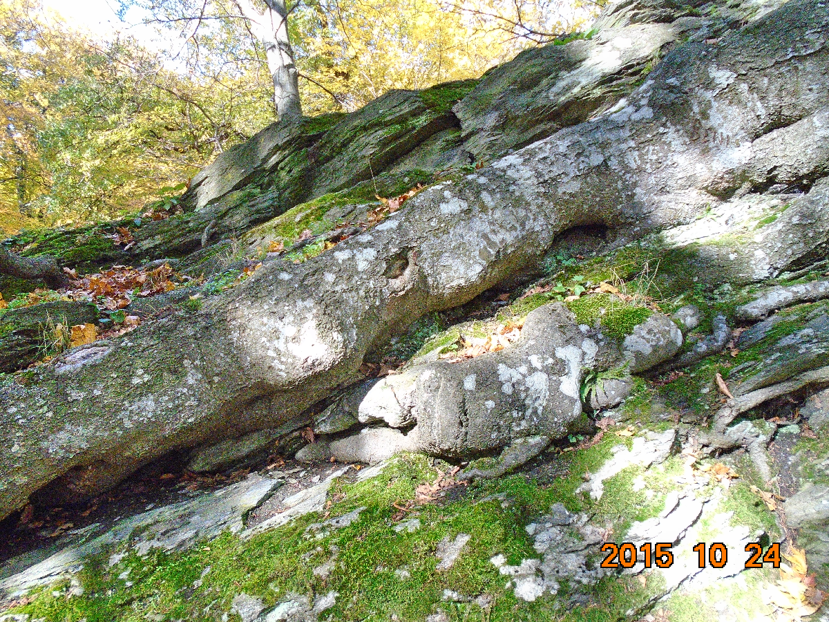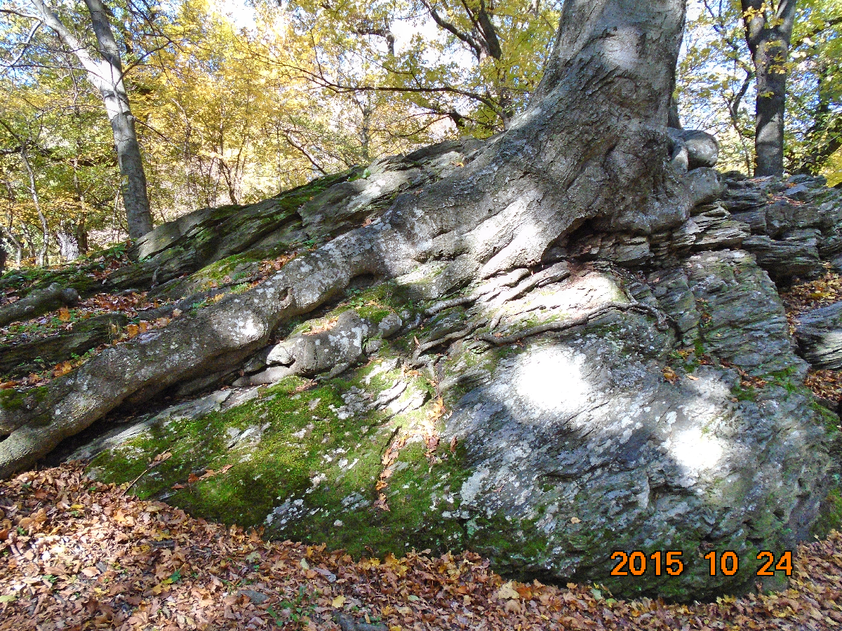 Kis pihenő után indulunk tovább mai második ládánk felé, melyet a Borha-forrásnál helyezett el a rejtője. Ez tulajdonképpen egy multi láda, mert a Jávor-kútnál is van egy pontja. Elhaladunk a Kéktúrás emlékmű mellett, de erről nem sikerült a fénykép. Látunk viszont egy bükköt, mely gyökereivel egy sziklát ölel körbe úgy, mintha markolná. Érdekes látvány. Néha nehéz eldönteni, hol kezdődik a fa és hol végződik a szikla, olyan szimbiózisba kerültek az idők folyamán.