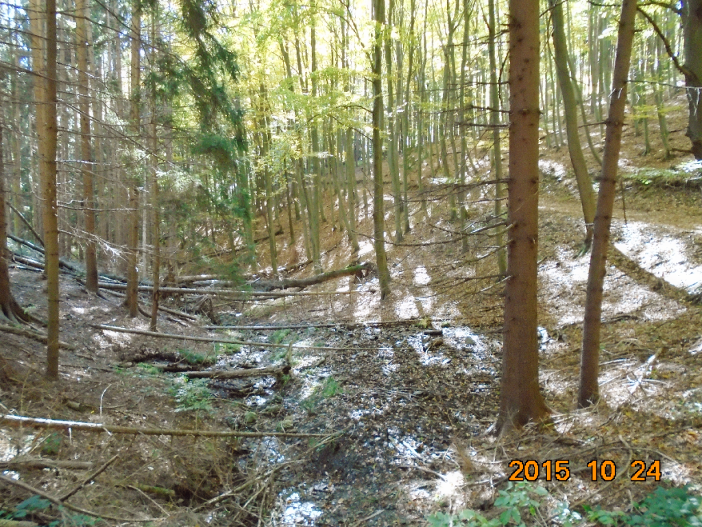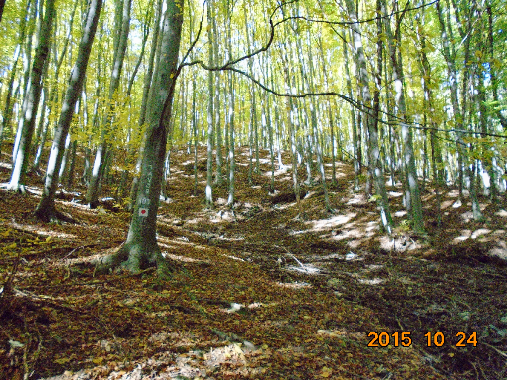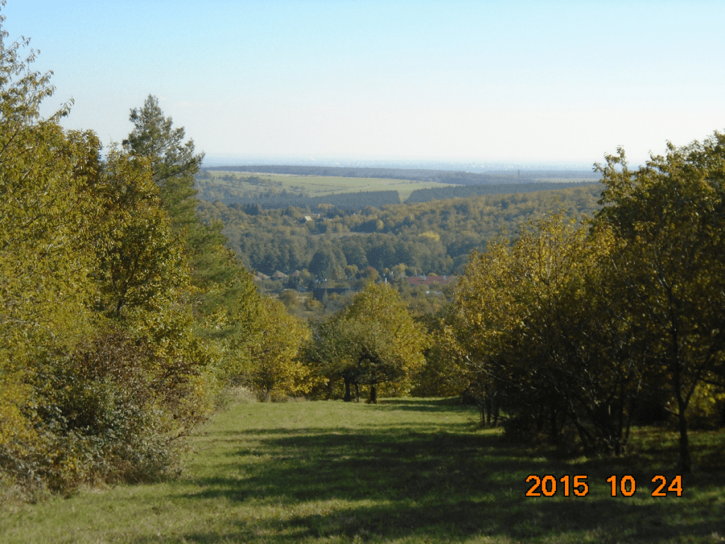 jelzésen haladunk. A kiritkított erdő fái között szép kilátás nyílik a völgy túloldalára.