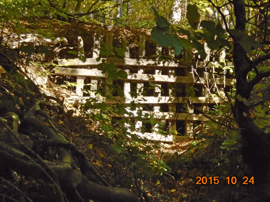 A láda pár tíz méterre, egy terebélyes fa gyökerei közti üregben pihen. Sajnos, nekünk nem sok pihenő jut, mert a nap, így október végén, már korán nyugszik és mivel lámpákkal nem készültünk, még világosban vissza kell jutnunk Velembe. Útközben egy barlang mellett vezet el az utunk, de a szádát farács védi a látogatóktól.
