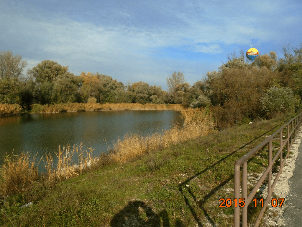 Hosszú, eseménytelen gyaloglás után érünk a Téglagyári tóhoz. Itt befordulunk a Vulkán-fürdőhöz, mely szintén a multiláda egy pontja. Közben megnézzük a tavat is. Nádas partjával jó kis horgászvíz lehet! A fürdőnél elég nagy a forgalom, ami a termál víz jelenlétének fényében érthető.