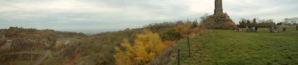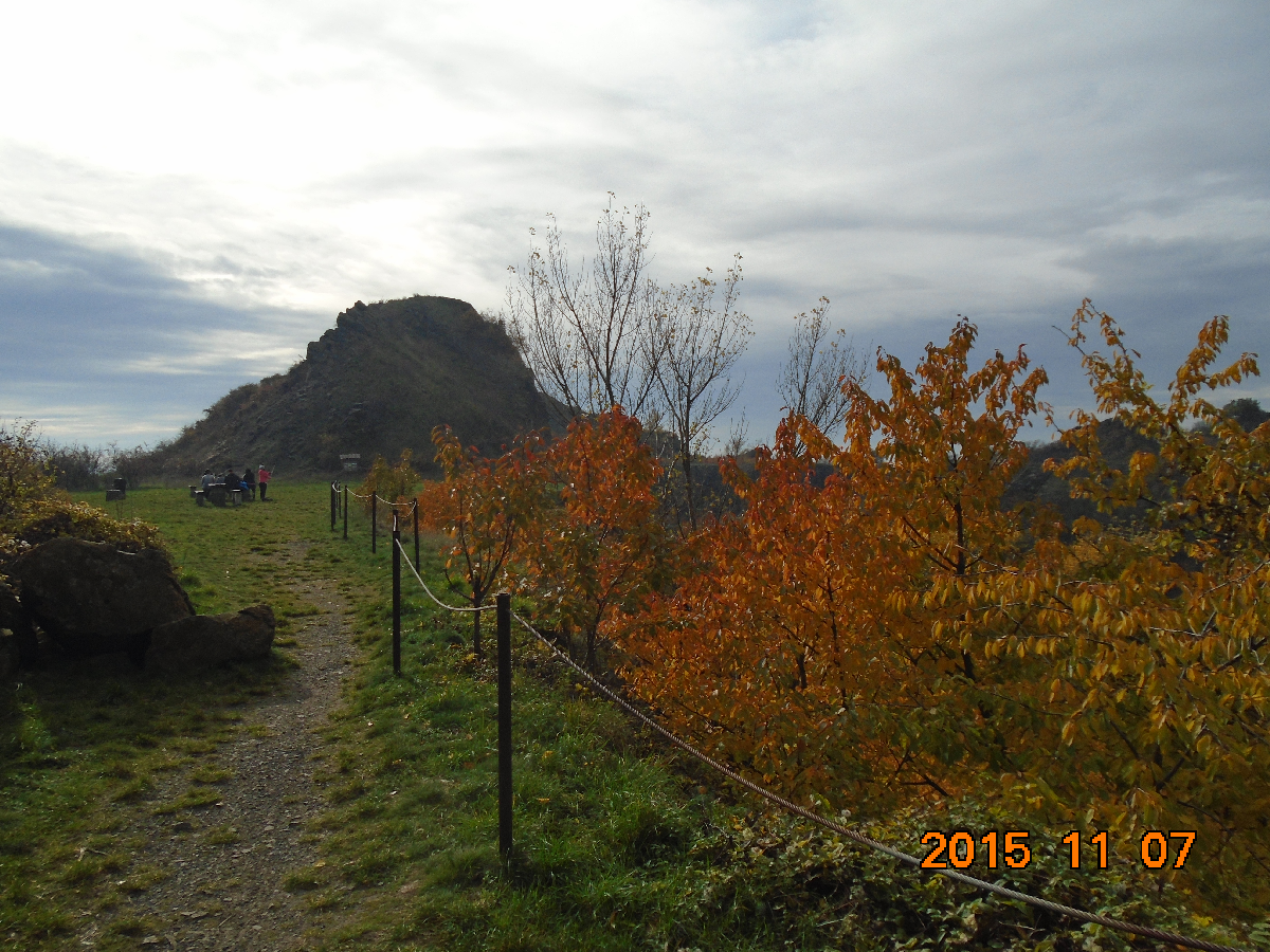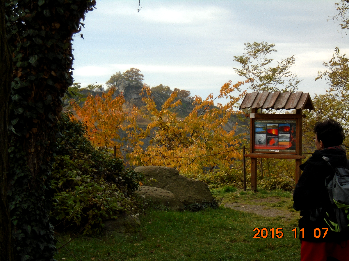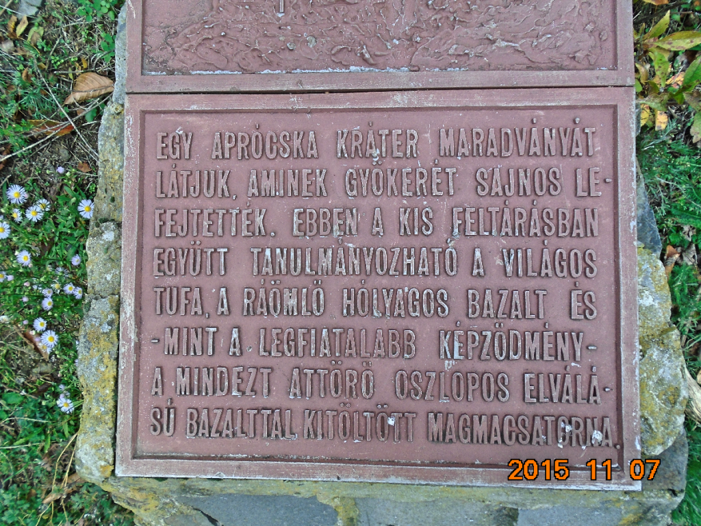 Ebéd után nekivágunk a következő lépcsősornak, mely felvisz a platóra. Felérve, olvasgatjuk a tanösvény tábláit és szemügyre vesszük az egykori kőbánya megmaradt létesítményeit. A tűzhányó lávájából kialakult kőzetet ugyanis 50 évig bányászták és út-, valamint vasútépítéshez használták. Az úton sétálva felváltva ismerkedünk a tűzhányó történetével, geológiájával és a bányászat emlékeivel, valamint annak technológiájával. Legelőször a láda felé vesszük az irányt, amit kis keresgélés után meg is találunk. Elég ramaty állapotban van szegény, ugyanis lyukas és a benne lévő logbook is betelt és nedves. Sajnos a rejtekadó üregbe, a nálunk lévő egyesületi cseredoboz nem fér be, így majd csak a logunkban fogunk tudni utalni a karbantartás szükségességére. Visszafele jövet, elmegyünk a trianoni kereszt előtt és nagyon élvezzük a késő őszi környezetet. A sok színes levél még zöldekkel keveredik a hosszúra nyúlt nyár miatt. Igazából csak néhány napja csökkent le a hőmérséklet és ez láthatóan megzavarta az élővilágot. Sok fa zölden hullatja leveleit, pedig már novembert írunk.