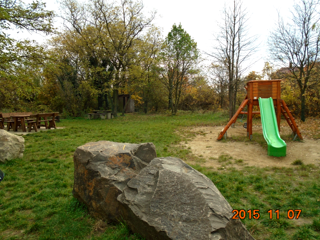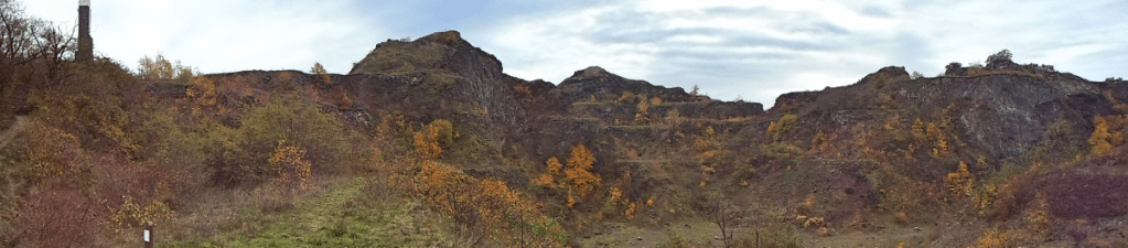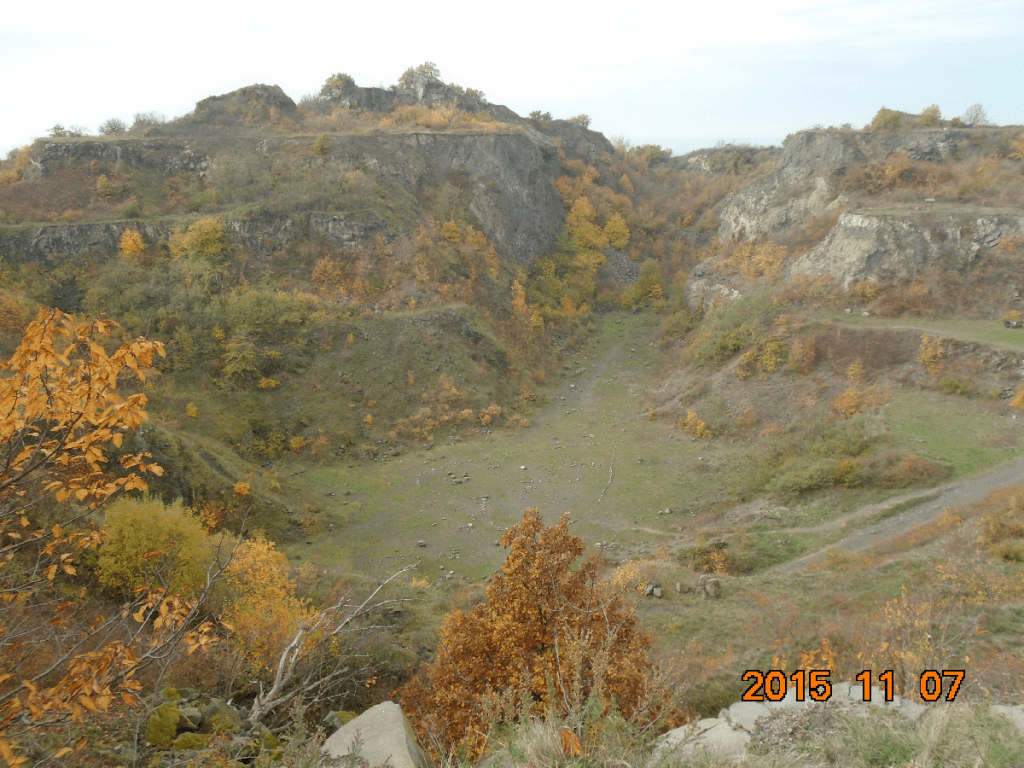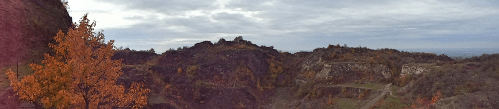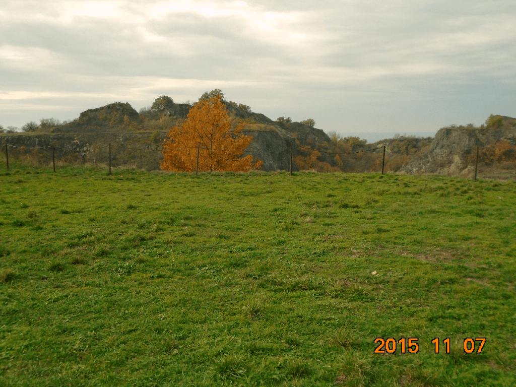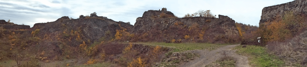 Ebéd után nekivágunk a következő lépcsősornak, mely felvisz a platóra. Felérve, olvasgatjuk a tanösvény tábláit és szemügyre vesszük az egykori kőbánya megmaradt létesítményeit. A tűzhányó lávájából kialakult kőzetet ugyanis 50 évig bányászták és út-, valamint vasútépítéshez használták. Az úton sétálva felváltva ismerkedünk a tűzhányó történetével, geológiájával és a bányászat emlékeivel, valamint annak technológiájával. Legelőször a láda felé vesszük az irányt, amit kis keresgélés után meg is találunk. Elég ramaty állapotban van szegény, ugyanis lyukas és a benne lévő logbook is betelt és nedves. Sajnos a rejtekadó üregbe, a nálunk lévő egyesületi cseredoboz nem fér be, így majd csak a logunkban fogunk tudni utalni a karbantartás szükségességére. Visszafele jövet, elmegyünk a trianoni kereszt előtt és nagyon élvezzük a késő őszi környezetet. A sok színes levél még zöldekkel keveredik a hosszúra nyúlt nyár miatt. Igazából csak néhány napja csökkent le a hőmérséklet és ez láthatóan megzavarta az élővilágot. Sok fa zölden hullatja leveleit, pedig már novembert írunk.