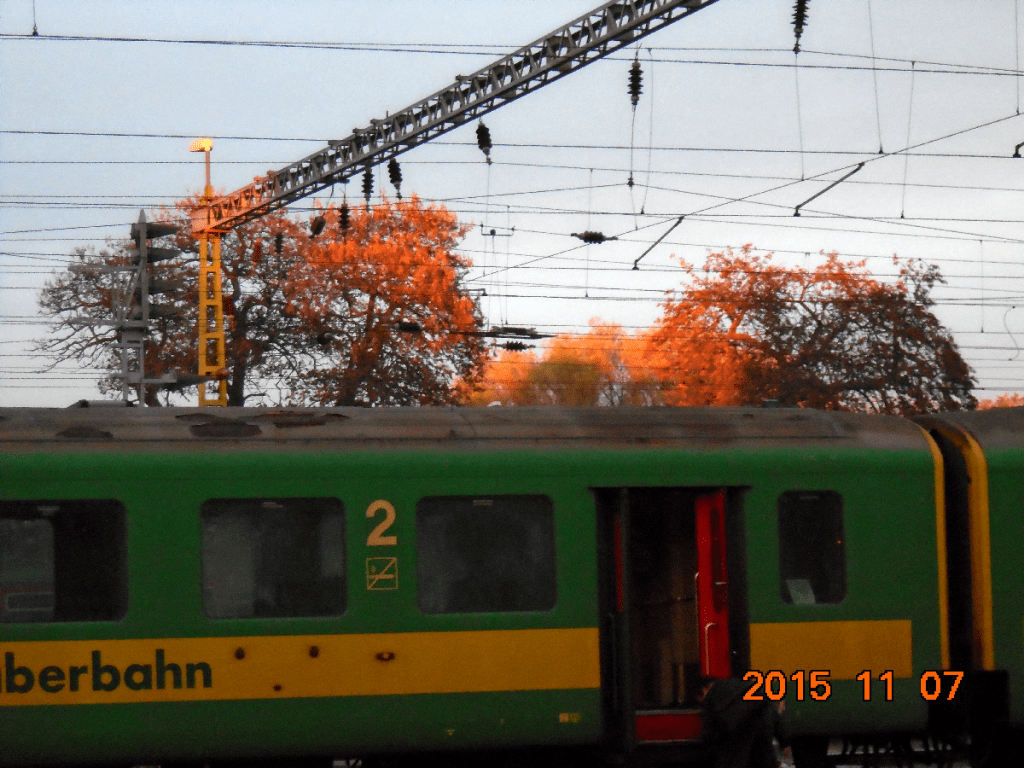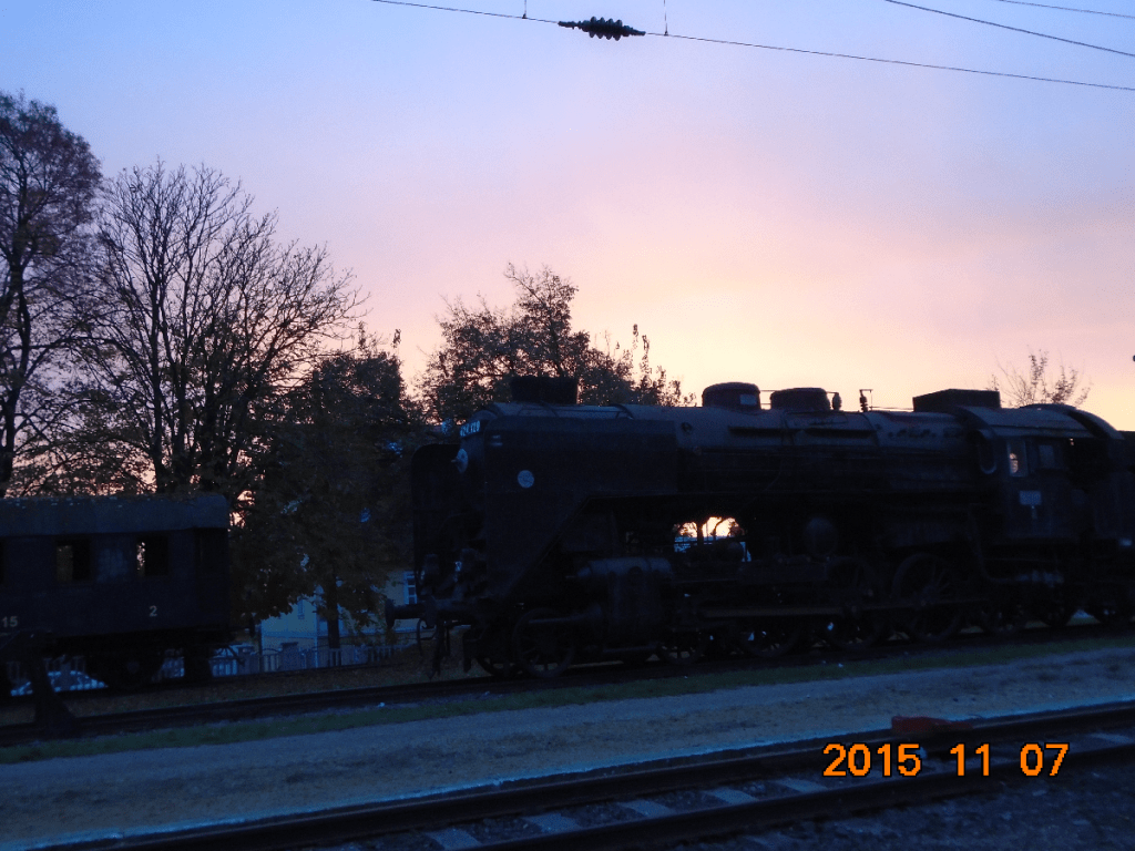 Visszatérve az állomásra, érdekes látvány fogad. A lemenő nap fénye által vörösre festett fák szinte világítanak. Ezzel a képpel búcsúzik tőlünk Celldömölk. A peronról még készítek egy képet a szobormozdonyokról, melyeknek már csak a sziluettje látszik.