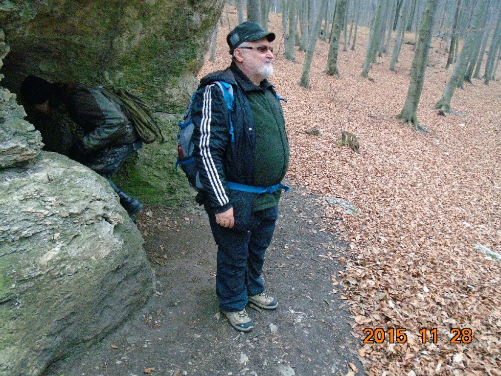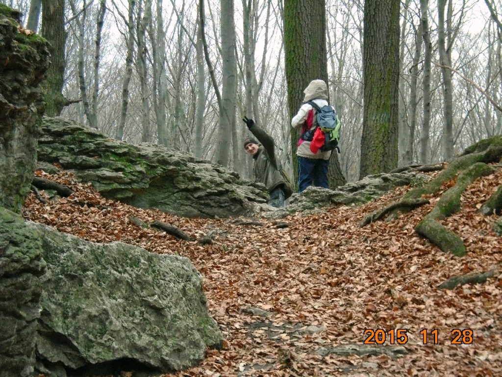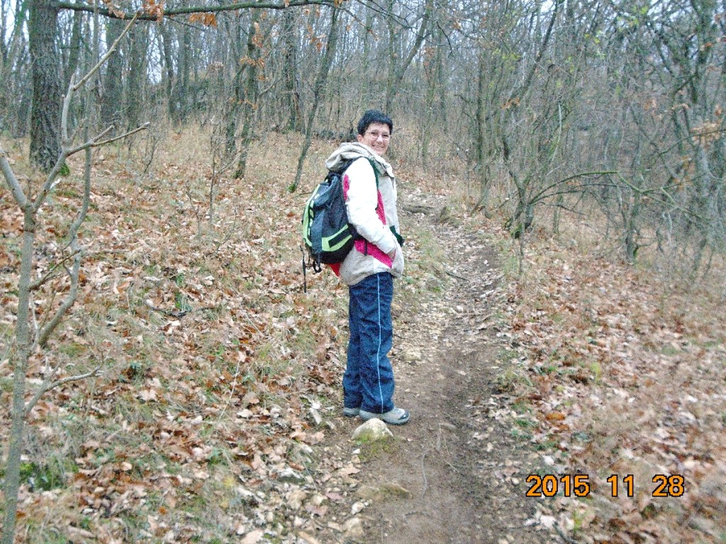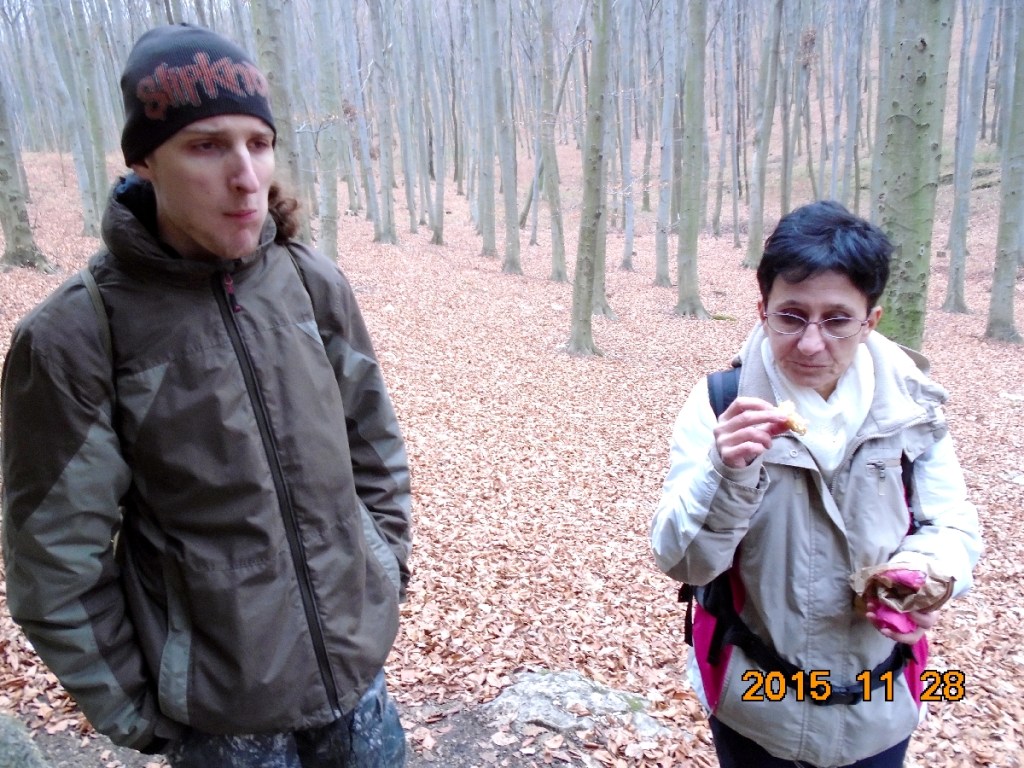 -ön folytatjuk utunkat. Csendes erdei úton megyünk, hol fenyvesben, hol lombhullató fák között. Ez utóbbiak már megszabadultak lombozatuktól. A két héttel korábban Békéscsabán tapasztalt színorgia a múlté, itt már szinte tél van. A hőmérséklet is ezt mutatja, Vé fázik is rendesen, mint rendesen. A jókedvünk azért töretlen. A szél alig mozdul, a levegő jó, mi kell még? Találunk egy fát, melynek tönkje olyan, mint egy szék. Zoli ki is próbálja rögtön. Vé a hideg ellenére szokatlanul vidám.