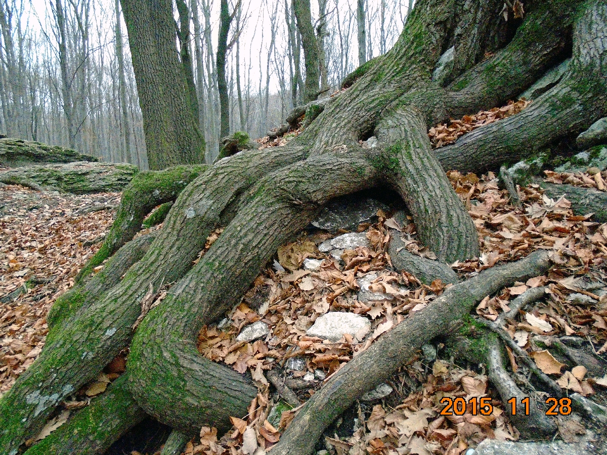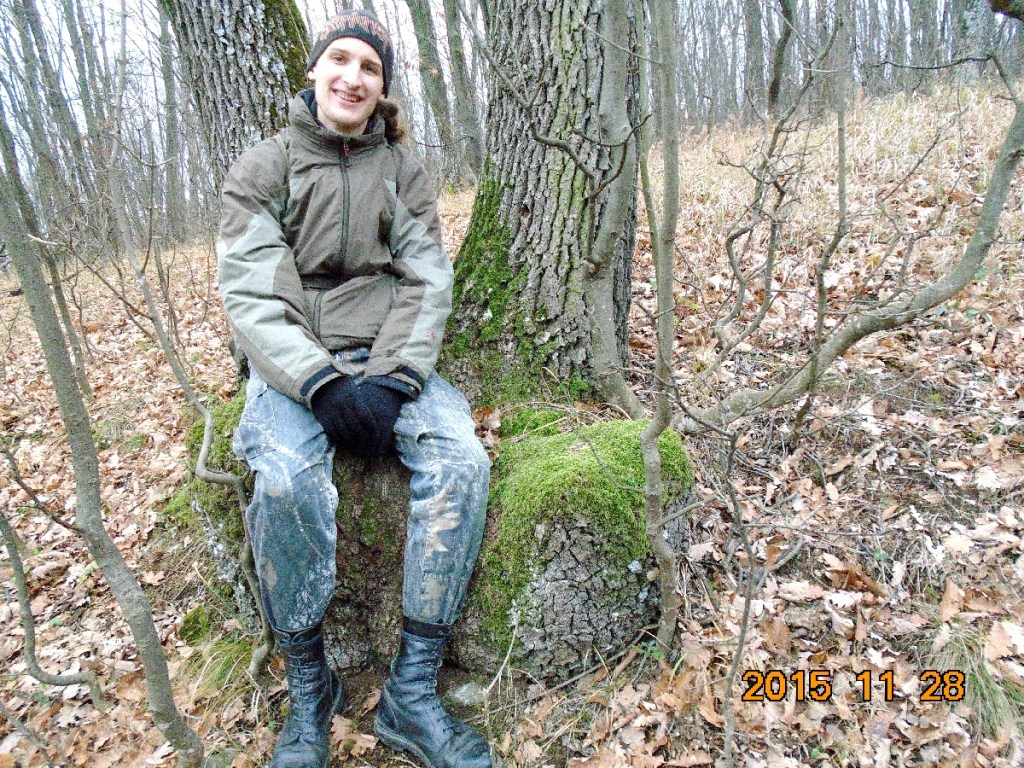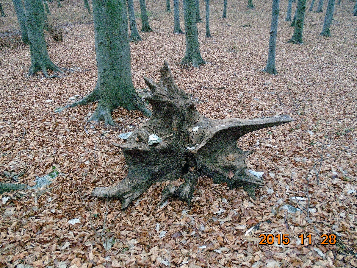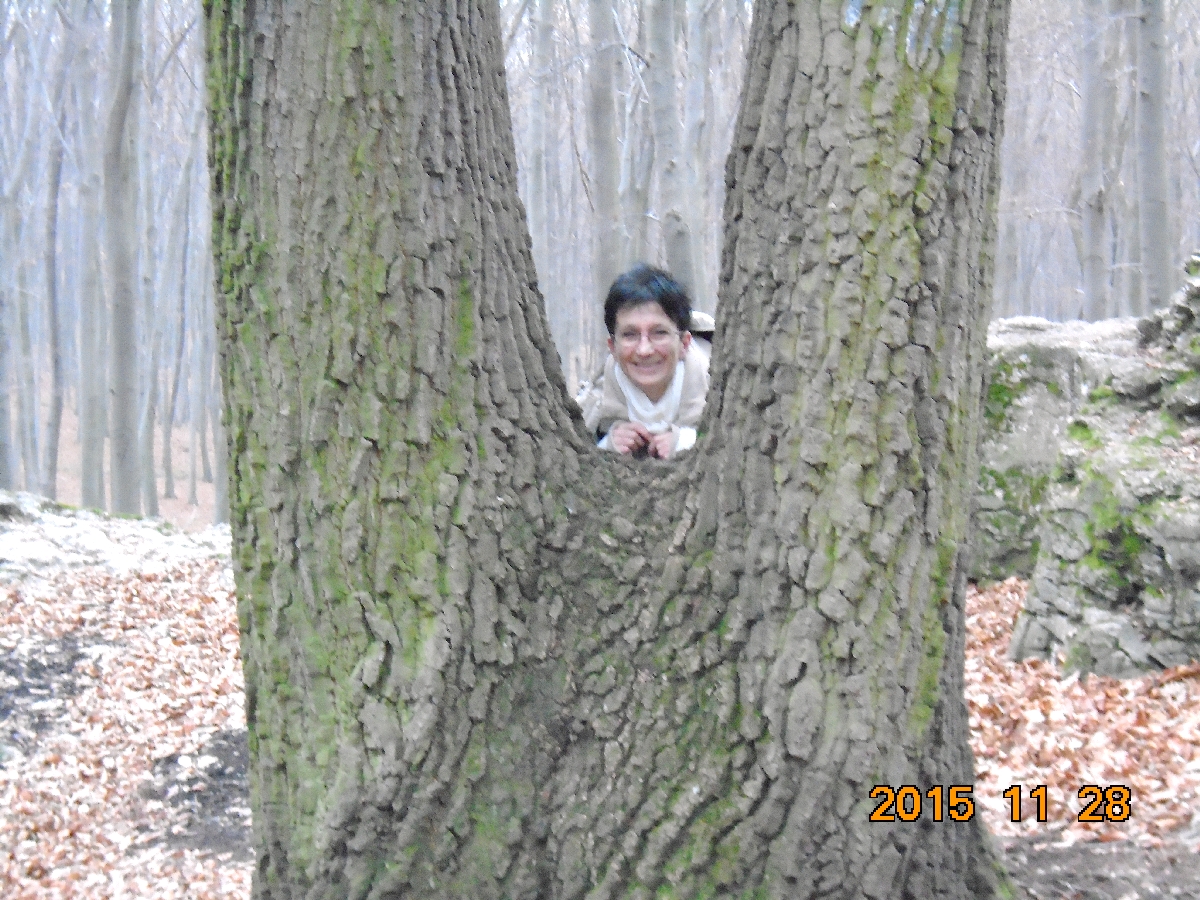 -ön folytatjuk utunkat. Csendes erdei úton megyünk, hol fenyvesben, hol lombhullató fák között. Ez utóbbiak már megszabadultak lombozatuktól. A két héttel korábban Békéscsabán tapasztalt színorgia a múlté, itt már szinte tél van. A hőmérséklet is ezt mutatja, Vé fázik is rendesen, mint rendesen. A jókedvünk azért töretlen. A szél alig mozdul, a levegő jó, mi kell még? Találunk egy fát, melynek tönkje olyan, mint egy szék. Zoli ki is próbálja rögtön. Vé a hideg ellenére szokatlanul vidám.