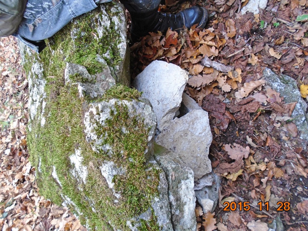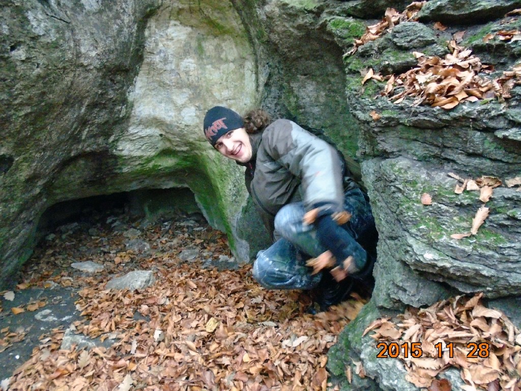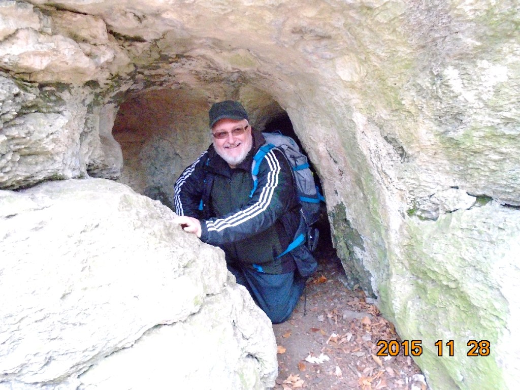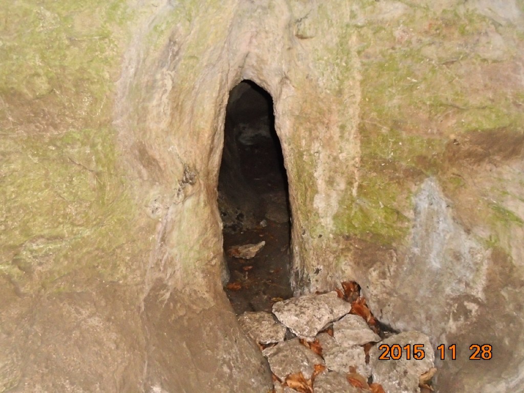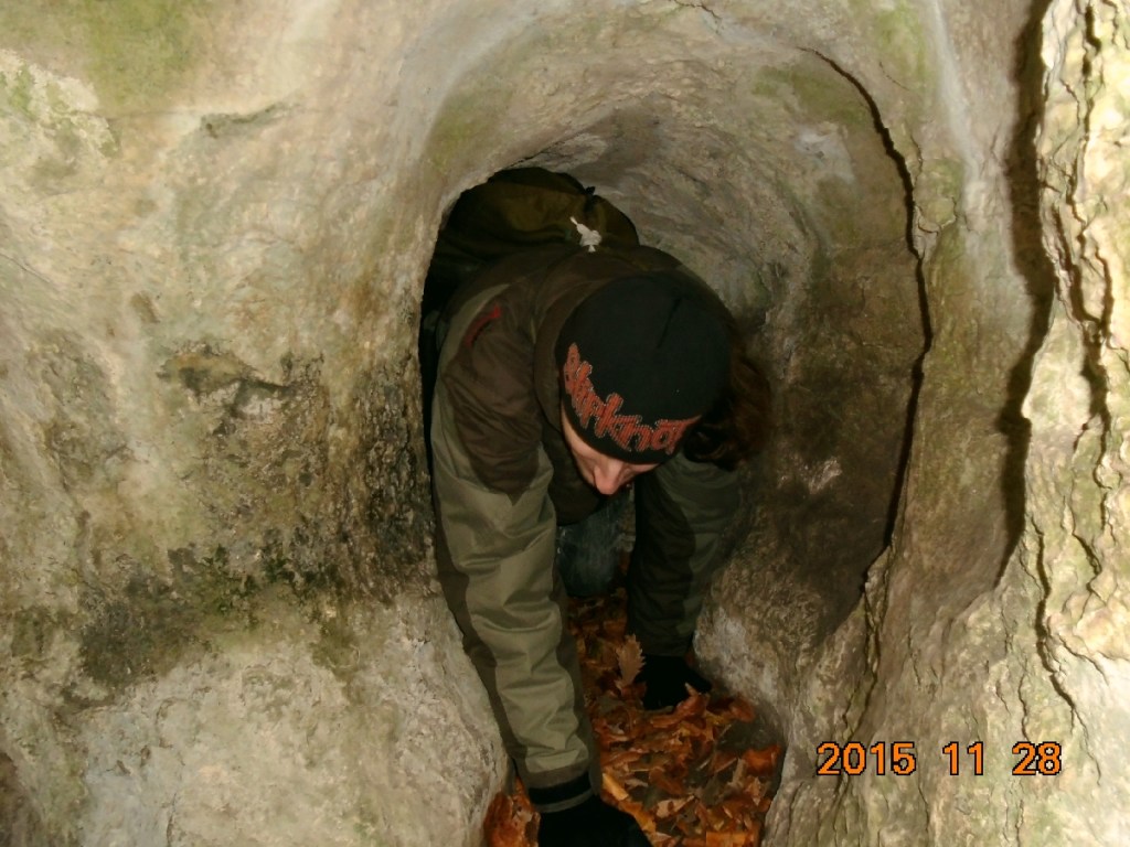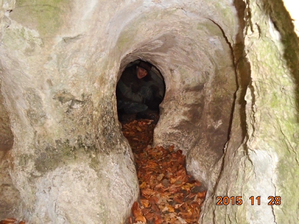Aztán jön, ahogy hivatalosan nevezik, átjáróbarlang felderítése. Bár csak 15-20 m hosszú, de barlanggá van nyilvánítva. Én bepróbálom magam a likba, de nem az én méretem. Mivel Magyarországon minden barlang védett, így lemondok a lik kibővítéséről.