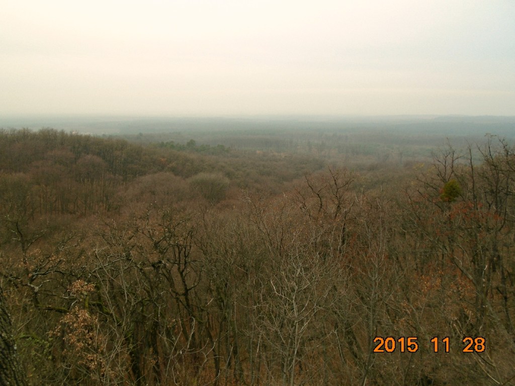 Éppen végeztünk, amikor befut egy nagyobb természetjáró csapat. A túravezető megmutatja, hogy tiszta időben melyik irányban látható Pápa és melyik irányban Pannonhalma. Most azonban a hegy lábáig is alig lehet ellátni, az őszi pára elnyeli a részleteket.