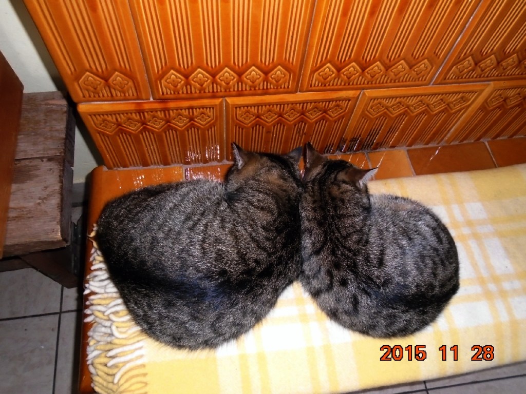Egy kis emelkedő után, már lefelé tartunk. Rövidesen feltűnnek a Hódos-éri üdülőházak, majd visszaérünk a Vinyéről kivezető országútra. A már ismert úton érünk a vasúti megállóhelyhez. Mivel még sok idő van a vonatig, úgy döntünk, hogy a közeli étteremben felmelegszünk kissé, de az zárva van, ezért a szomszédos vinye.hu nevű büfében kötünk ki. Itt barátságosan duruzsoló kályha ontja magából a meleget, ami nem csak Vé-nek, de már nekünk is jól esik Zolival. Úgy látszik a büfések tudtak róla, hogy jövünk, mert Vé kedvéért két macskát helyeztek el a kemence padkán.