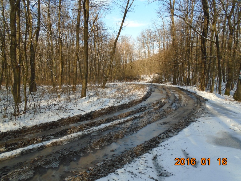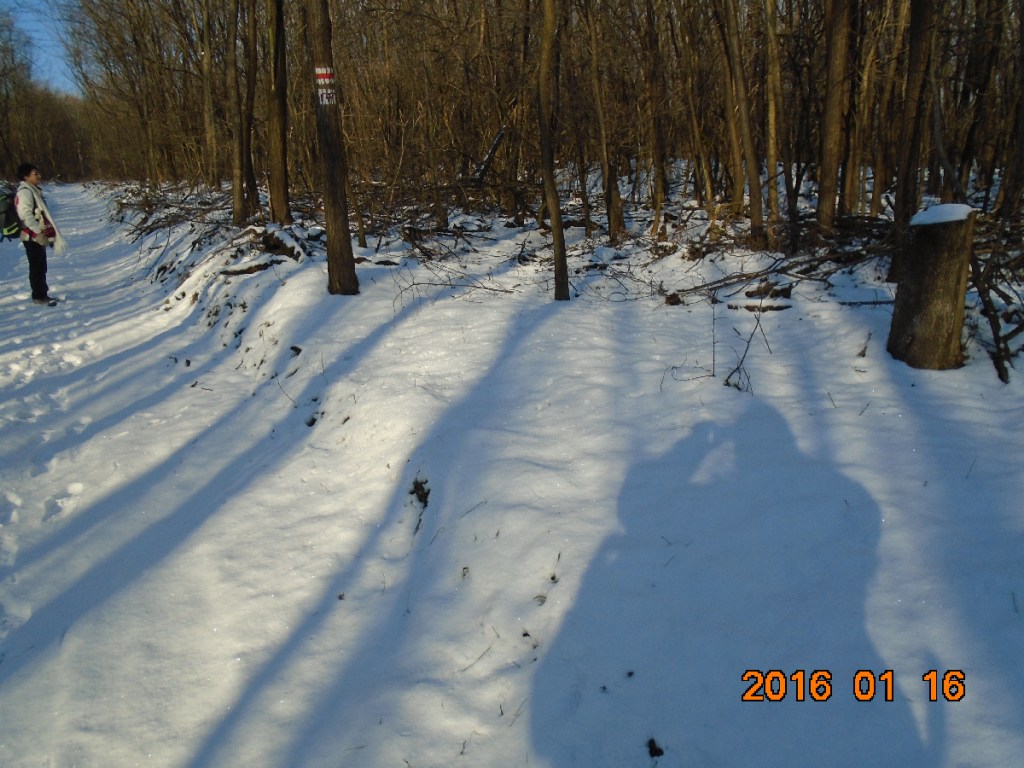 A napsütésben hőérzetünk és hangulatunk magasabb szintre hág. Még Vé is elfelejti ötpercenként bemondani, hogy fázik. Az úton helyenként meglepetésben van részünk. Ugyanis a fanyűvők nehéz gépei alaposan felszántották az erdei utakat, alig lehet átjutni egyes szakaszokon. A vízen látható jég is csak illúzió, mert olyan vékony, hogy ha rálépünk, rögtön beszakad és sáros lébe merül a lábunk. Szerencsére a túracipőnk membránjai nem engedik a vizet a cipő belsejébe.