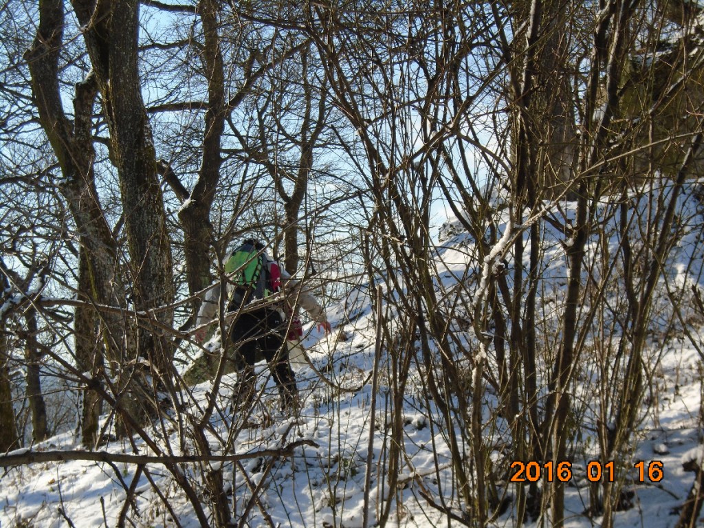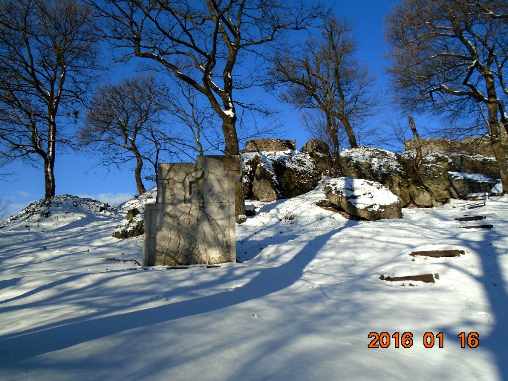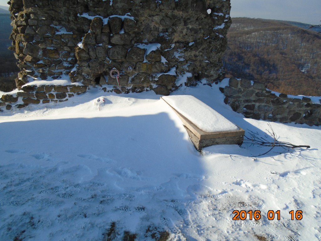 Vetünk még egy búcsúpillantást a falak maradványira, majd megkezdjük leereszkedésünket a Schaffer-kúthoz az északi oldalon. Most látjuk, hogy milyen jó döntés volt, hogy Drégelyvár vmh-től jöttünk felfelé, ugyanis a lefelé vezető út igen meredek és nagyon csúszik. A hó a korábbi ónos eső okozta jégrétegre esett, amit részben takar, részben ha rálépünk, sikamlós meglepetést okoz. Fényképezni nem tudok, mert igencsak kapaszkodni kell a füleimbe, hogy el ne zúgjak. Helyenként csak gatyaféken tudunk haladni, mert talpon maradni életveszélyes. Erről az oldalról, hiába rövidebb az út, nem tudtunk volna felkapaszkodni a várhoz. Szerencsére mindannyian épségben leérünk! Mivel a közelben lévő vasúti megállóhelyen télen a vonat nem áll meg, ezért be kell gyalogolnunk Drégelypalánkra. A településen megnézzük a Szondi emlékművet, majd a Várkapitány Vendéglőben egy-egy pohár bor mellett felmelegszünk, ami igencsak jól esik áthűlt testünknek. Vé is kipróbálja a Jézuskától kapott, új okostelefonjának fotós képességeit. Most már használható, nem VGA minőségű képeket készít.