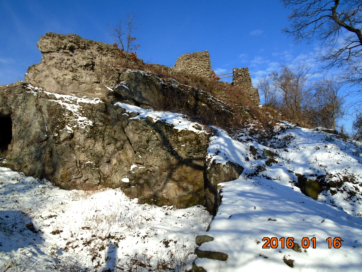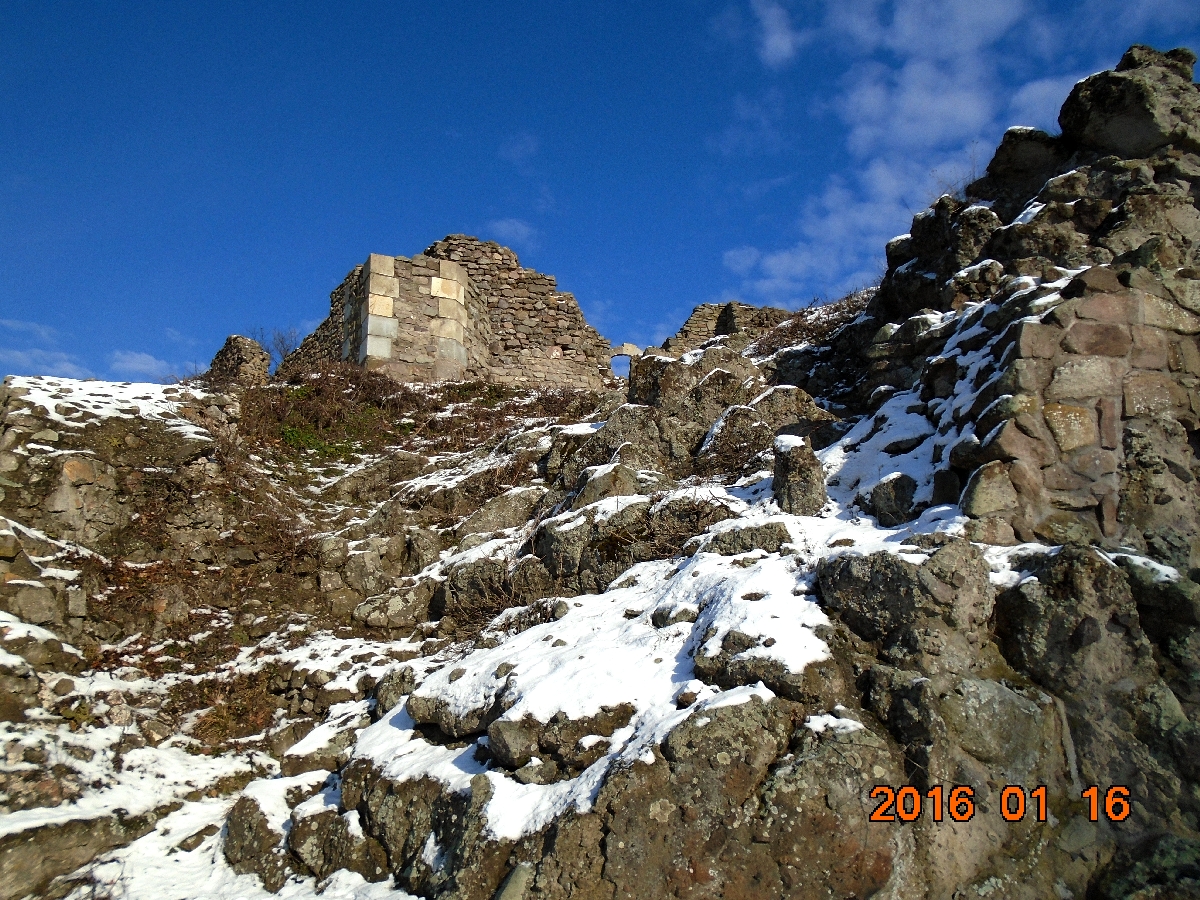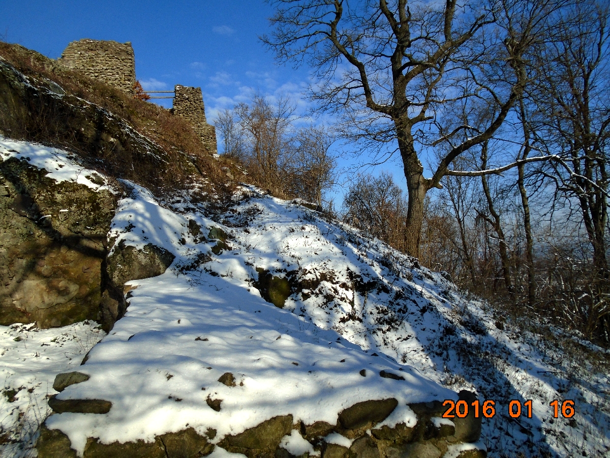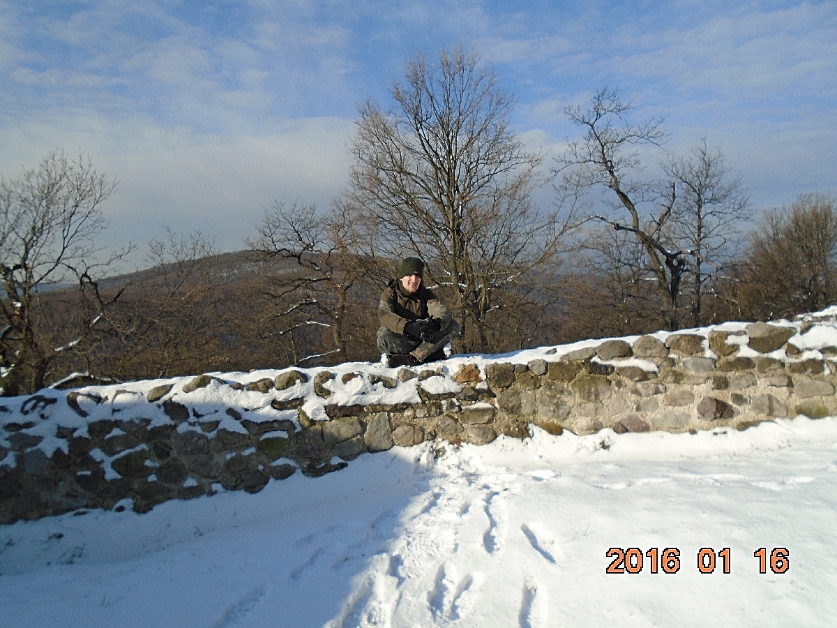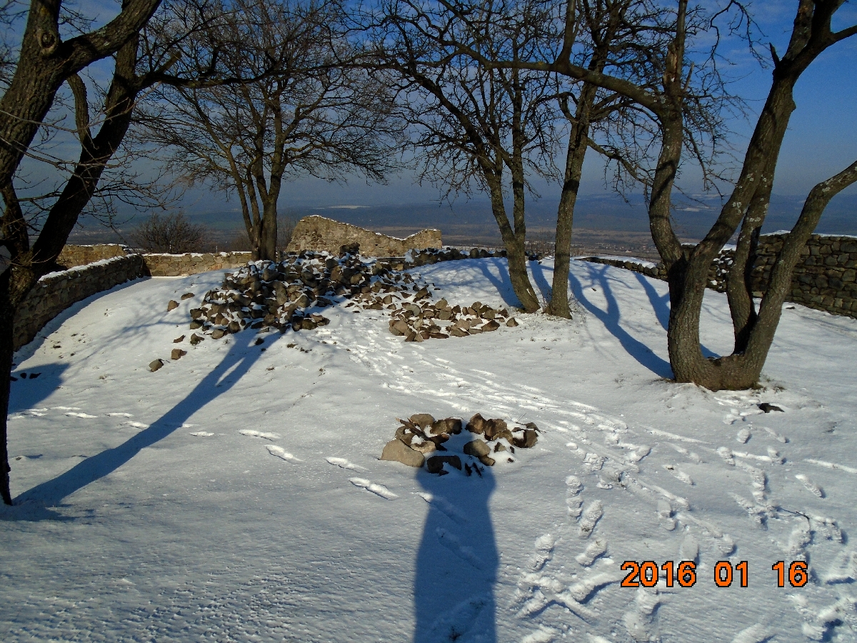 Következik a vár alsó részének szemügyre vétele, majd a vár tövében lévő pihenőhelyen az ebéd elfogyasztása. Zolinak nem jó a jeges pad, törökülésben kiül az egyik havas várfaldarabra és pasaként tekintget körbe.