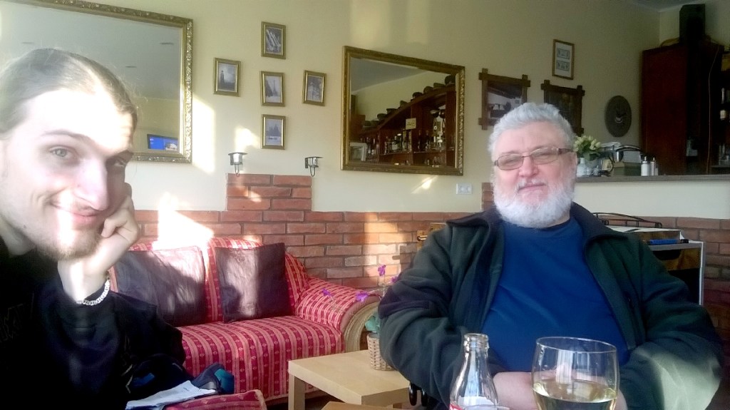 Evés közben mi Vé-vel ácsorgunk, mert nekünk sem a pad, sem a várfal nem jó, közben felváltva, hol a várat, hol a környező tájat szemléljük, mellyel az Alföldhöz szokott szemünk nem tud betelni.