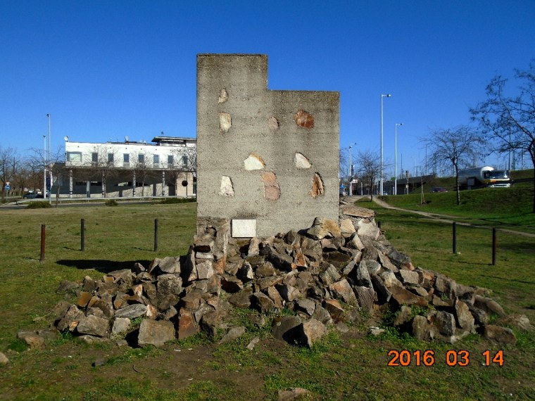 Elmegyek a Knorr-Bremse üzeme mellett. Ez ismerős név, többek között a vasúti járművek fékberendezéseit készítik itt. Több nagy üzem volt erre valaha. Most legtöbb feldarabolva, ilyen-olyan KFT-k üzemelnek a területen. Sok épület raktárházként szolgálja a jelenkort. Próbálom kibetűzni az eredeti cégek neveit, de még a régi betűk helye is megkopott már a falakon. Azért sikerült beazonosítani a volt Pesterzsébeti Papírgyárat, a Posta Elszámoló Központot, meg talán a FÉG (Fegyver- és Gázkészülékgyár) telephelyét, de az utóbbiban nem vagyok biztos. Rossz látni, ahogy a régi, nagy múltú üzemek szétforgácsolódtak, eltűntek. Közben a túloldalon észre veszek egy kápolnát. A térkép elárulja, hogy a Segítő Mária kápolnáról van szó. Próbálom lefényképezni, de a folyamatosan áramló járműforgalom miatt, szinte folyamatos takarásban van. A nagy nézelődésben észre sem vettem, hogy átléptem Pesterzsébet határát. Átverekszem magam a Csepeli átjáró labirintusán. Folytatódik az iparterületek sora. Már megszámolni sem tudom, hány autószervízt, alkatrészboltot és szalont hagytam el. A nagy zsúfoltságban egyszer csak a Közvágóhídnál találom magam. Itt búcsút veszek eddigi vezetőmtől a HÉV-vonaltól. Beveszem magam a felüljárók alatti terekbe és próbálom megtalálni a Ferencvárosi pályaudvar felé vezető irányt. Jó pár lámpás gyalogátkelőhely után (minden lámpa piros és várni kell), célirányba fordulok a Máriássy utca sarkán. Aztán ez az út elkanyarodik. Egy kis zöldterülethez érek, melyen egy szobor áll. Ide igyekszem. Nem olyan egyszerű az átkelés, legalábbis szabályosan nem. Olyan, mintha az illetékesek nem akarták volna, hogy bárki is megnézze ezt az emlékművet. Hátulról cserkészem be.