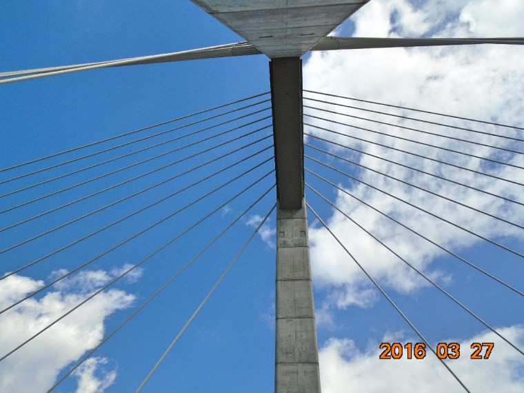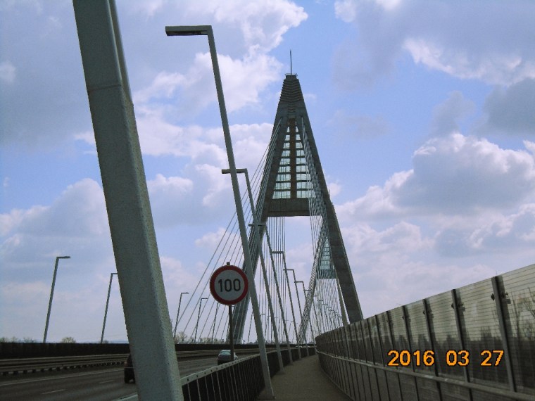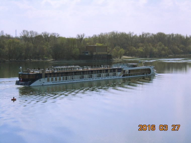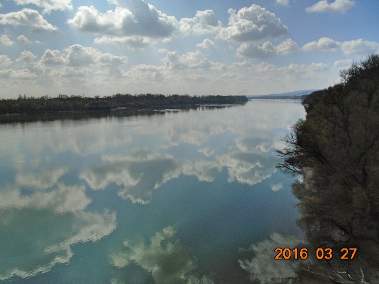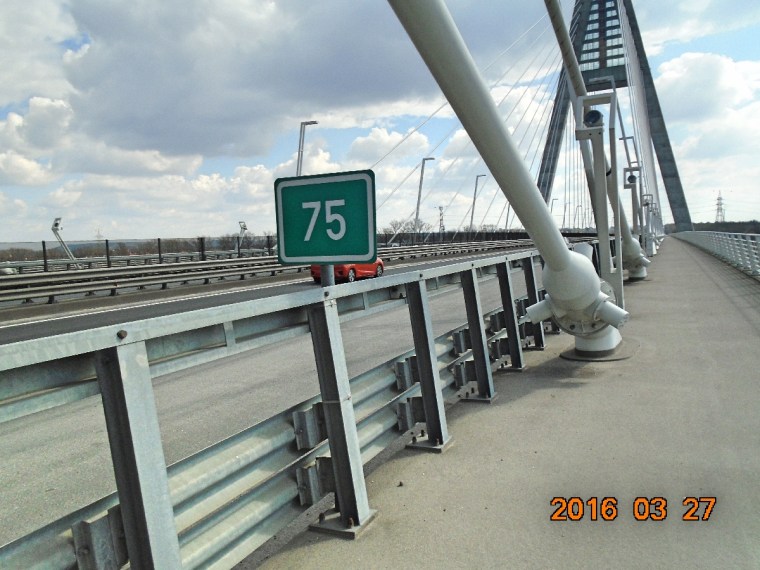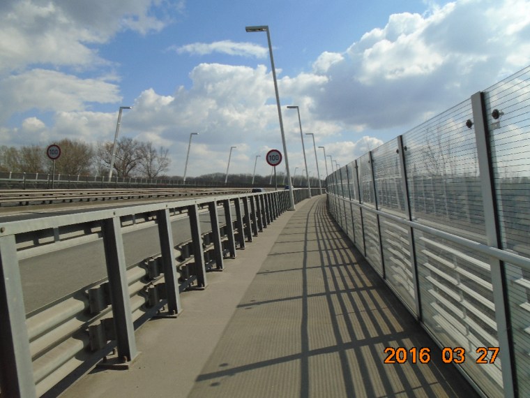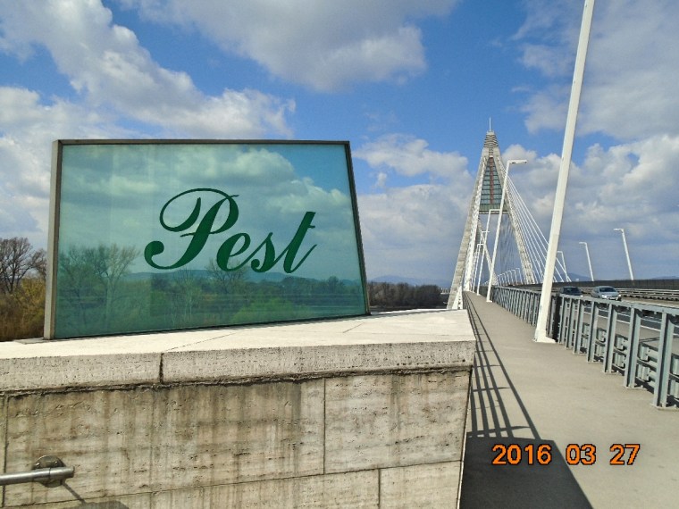 A térkép tanulmányozása után kiderül, hogy az autós közlekedésből is jól ismert lóhere módszert kell követnünk. Átmegyünk a híd alatt, majd egy bekötőúton balra fordulva megyünk a budai feljáró végének irányába. Aztán megint át a híd alatt, mert a gyalogjáró a túloldalon van, ez az oldal a kerékpárosoké. Jó, hogy így szétválasztották a gyalogos és kerékpáros forgalmat, mert így nincs konfliktushelyzet. Bár, azt nem tudom, hogy a gyalogosoknak rendelt út mennyire kihasznált, de nekünk jól jön a lehetőség. Elindulunk a végtelenül hosszúnak tetsző hídon. Jó pár fényképet készítek a hídról és kíváncsian tanulmányozom a szerkezetét. Átmegyünk a Lupa-sziget fölött is. Valaha ennek is volt ládája, de mintha azt olvastam volna, hogy megszűnt. A Dunáról is készül pár fénykép. A nyugodt vízen jól tükröződnek a gomolyfelhők. Szép. Egy hajó is elhalad alattunk, természetesen ez sem marad megörökítetlen. Aztán a hídfőnél egy tábla fogad “Pest”.