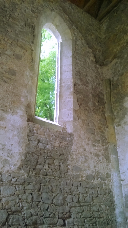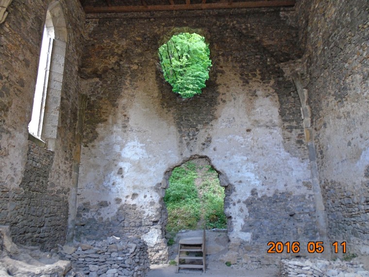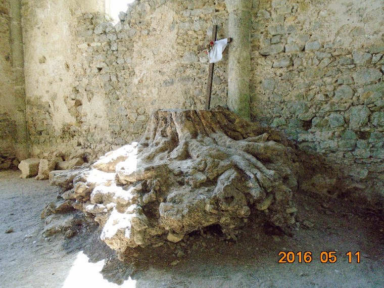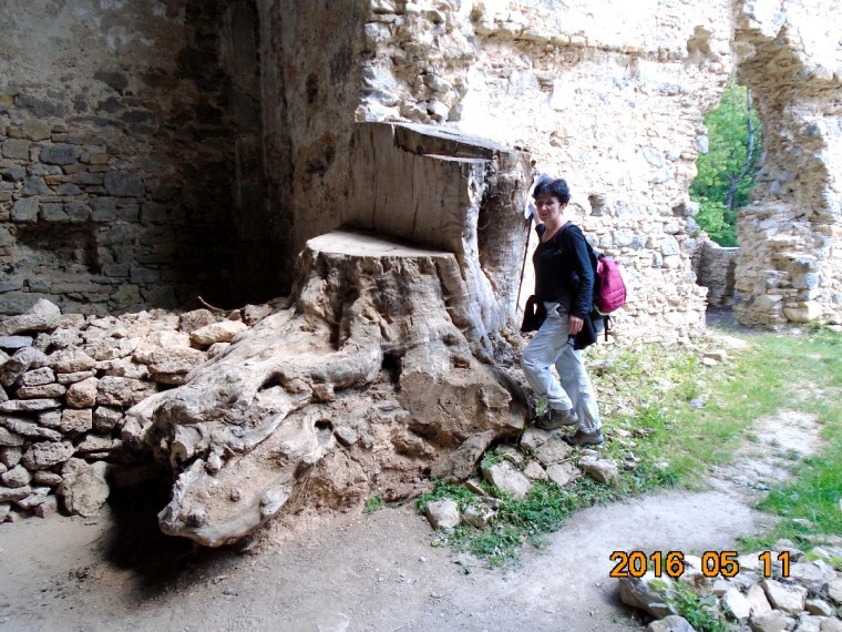 Az épület belsejében két hatalmas fatönk áll. Ezek a romokra nőhettek rá és a felújítás kezdetén vághatták ki őket. Az egyik nagysága jól látszik, ahogy Vé mellé áll.