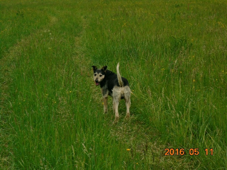 Nincs időnk sokat nézegetni, mert az eső előtt még szeretnénk megkeresni a falu geoládáját, amihez ismét ki kell mennünk a településről egy rétre. Közben egy “idegenvezető” kutyus is csatlakozik hozzánk. Parádésan megy előttünk. A ládát egy bokor rejti, illetve csak rejtette, mert már az előttünk járók is azt logolták, hogy nem találták. Mi és a kutyus kb. 15 percig keressük, de csak szétázott papírokat találunk egy fa tövében. Vé arcán látszik a csalódottság.