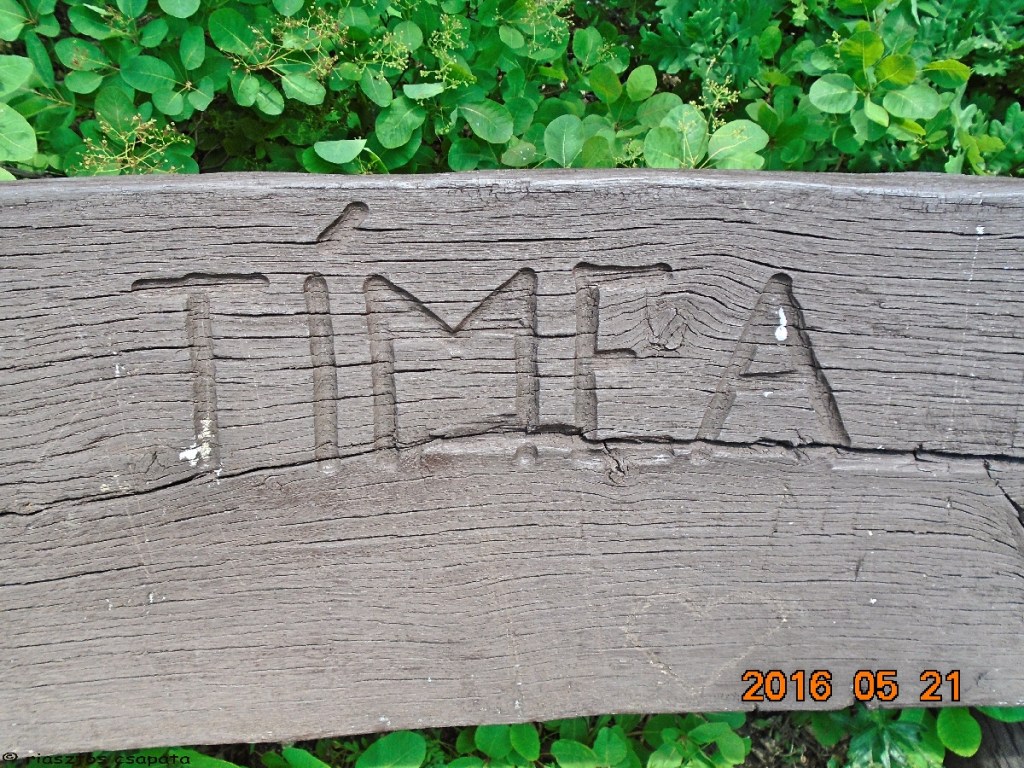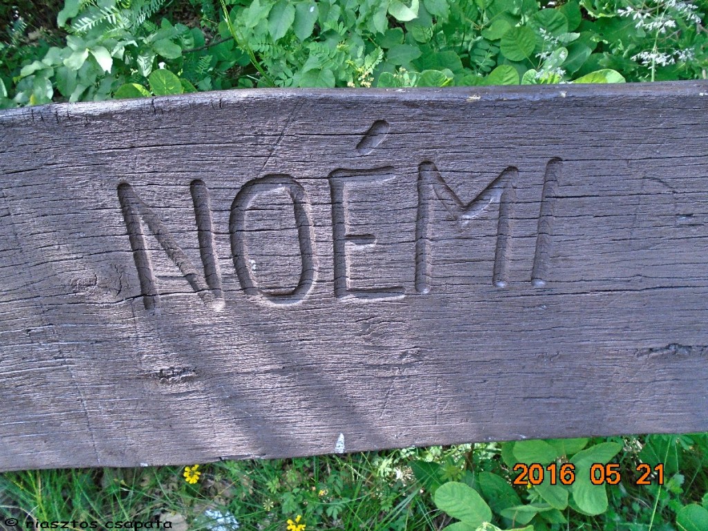 Tájkép nézés és pihenés után indulunk tovább. Feltételezésünk a meleg és az emelkedő kölcsönhatásáról helyesnek bizonyult. Még Vé is szenved, pedig Őt a lejtő szokta megviselni. Szerencsére, időnként “de szép innen a kilátás” felkiáltással, presztízs veszteség nélkül megállhatunk szuszogni. A tanösvény ismertető táblái is hasonló módon lehetőséget adnak a lihegés csillapítására. (Főleg, ha szótagolva olvassuk azokat.) Sajnálattal állapítjuk meg, hogy a kiépített pihenőhelyeken nem helyeztek ki szemeteseket, így az egész hegyet eldobált szemét tarkítja. A multiláda első pontját egy fára akasztott hengerben ismerjük fel igen helyesen, mert megtaláljuk benne a jelszó részletet. Ezután folytatjuk a hegy meghódítását. Az útközben elhelyezett pihenőpadok háttámlájába vésve az Aranyember c. regény főszereplőinek nevét látjuk a tanösvény megálmodóinak jóvoltából.