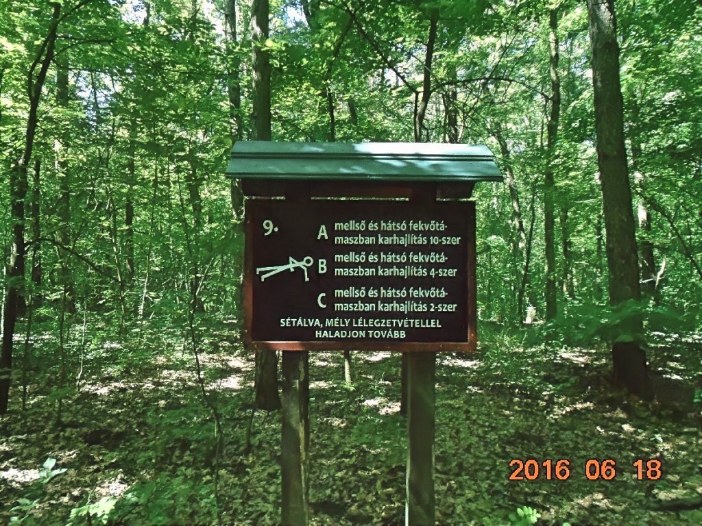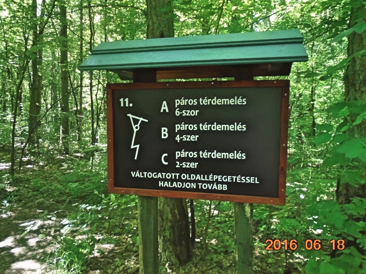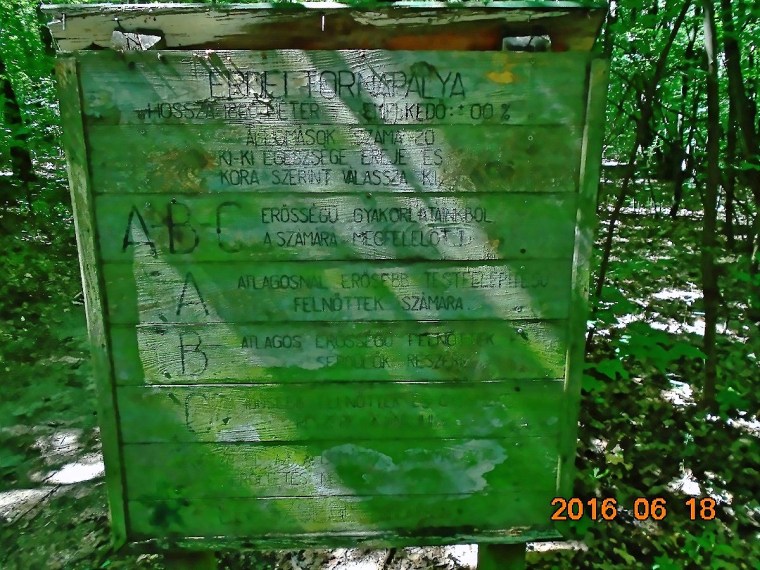 Érdekes, hogy a pályát megálmodók gondoltak arra is, hogy nem mindenki egyforma erős és korú, ezért a gyakorlatokat három, betűvel jelölt csoportba osztották. Mivel ez egy multiláda, mindjárt le is olvassuk a tábla hátuljáról a második pont koordinátáit. Ez a felirat is megkopott kissé, de azért kisilabizálható.