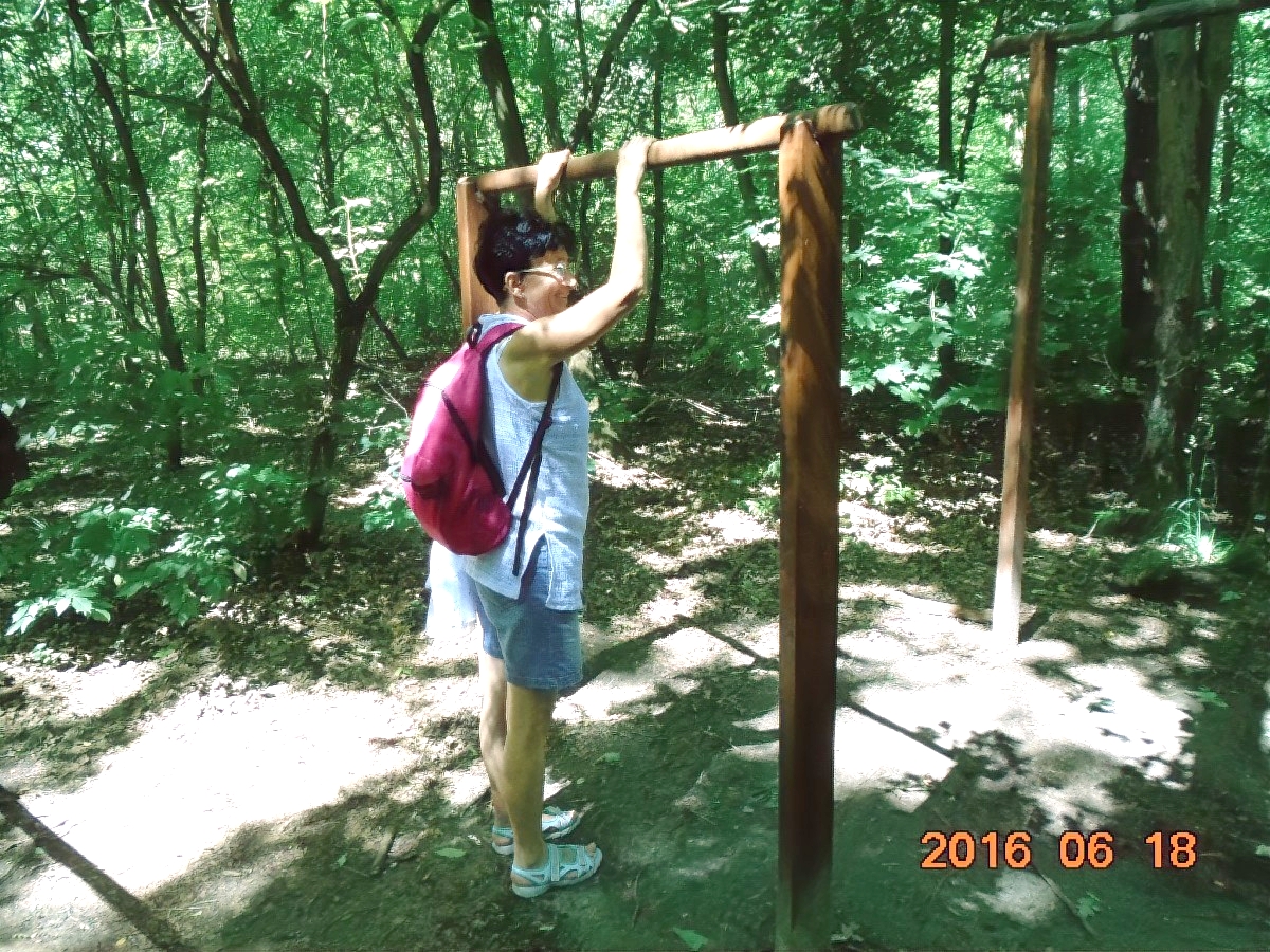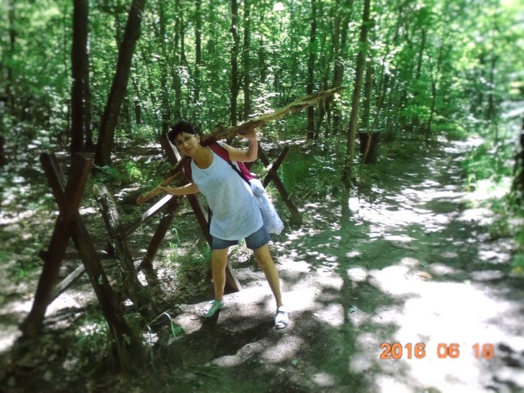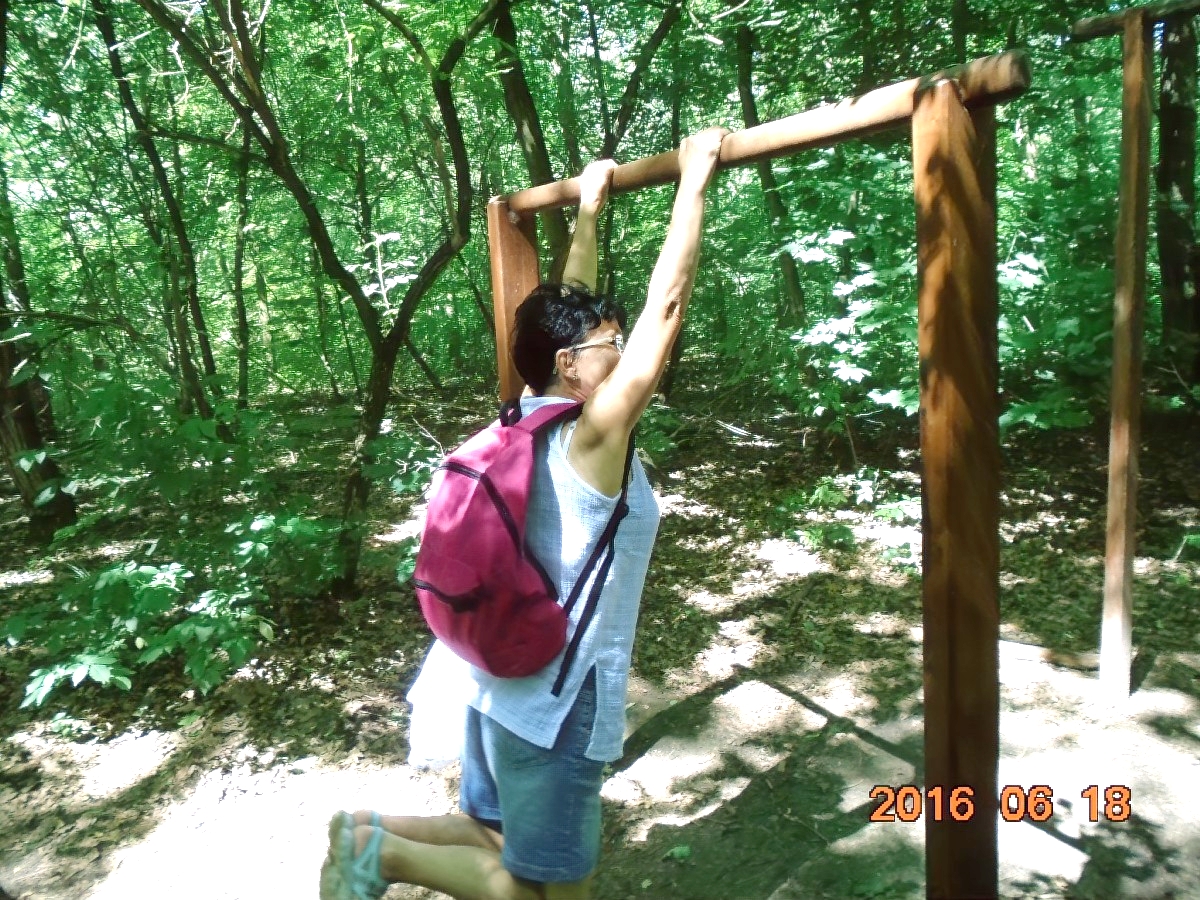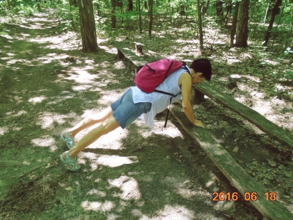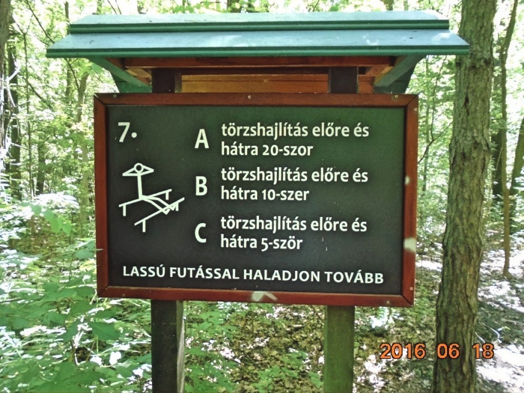 Hiába no, berozsdásodtak azok a ritkán használt izmok! De lehet hogy csak a hátizsák nehéz, melyet Vé nem akar letenni, egyetemben a kinyomtatott ládaoldalt tartalmazó papírlappal. Több, törzshajlításra biztató állomás után, eljutunk a törzsdöntésig. Itt Vé-nek már van annyi ereje, hogy rólam is készítsen egy képet, mert a gyakorlatokat természetesen én is csinálom rendesen. Persze a gyakorlat közbeni hátizsákviselés hagyományáról én sem mondok le. Ez már olyan védjegyünk lesz!