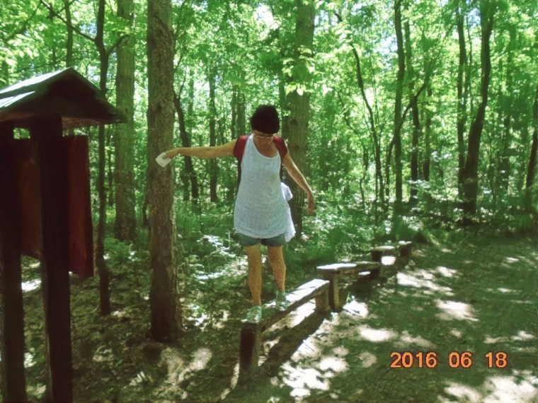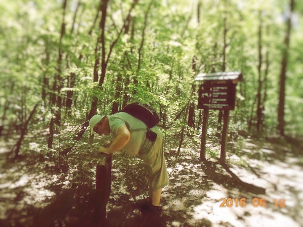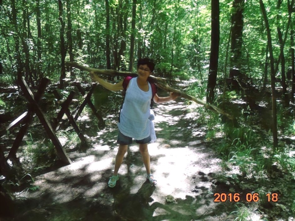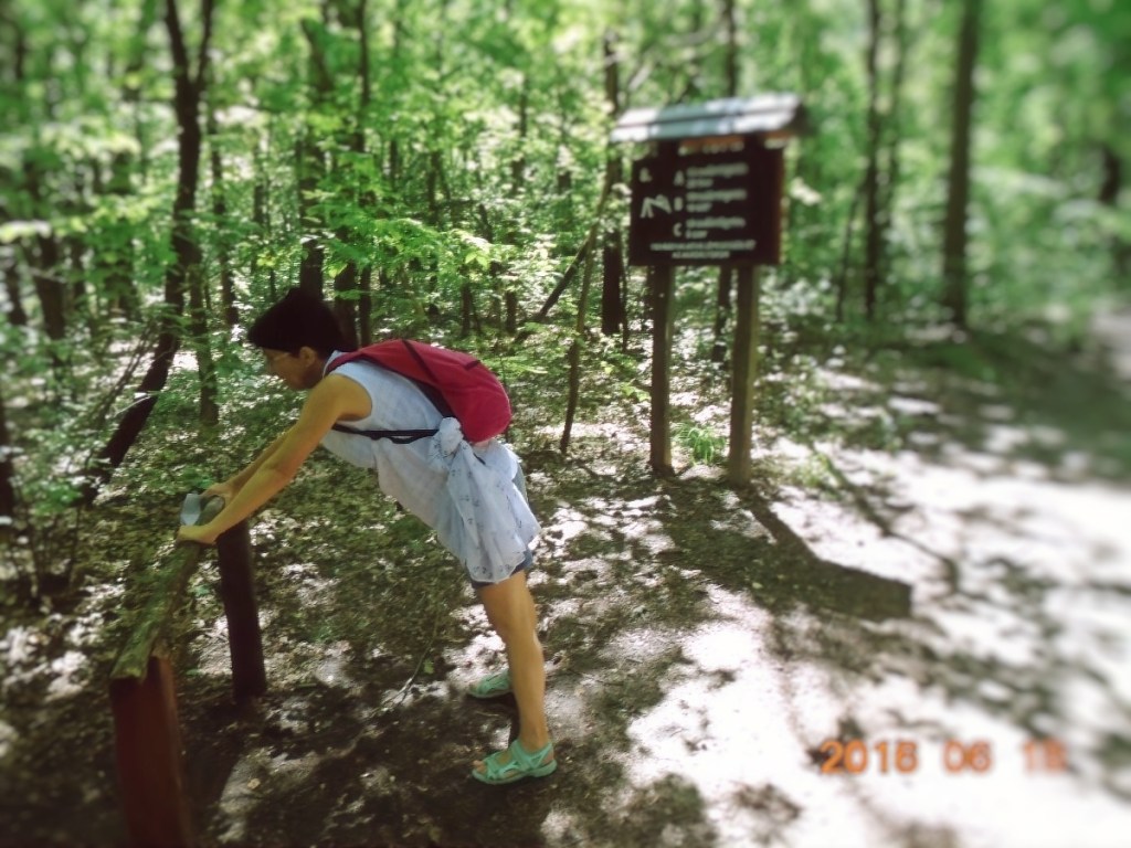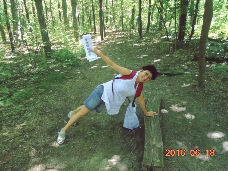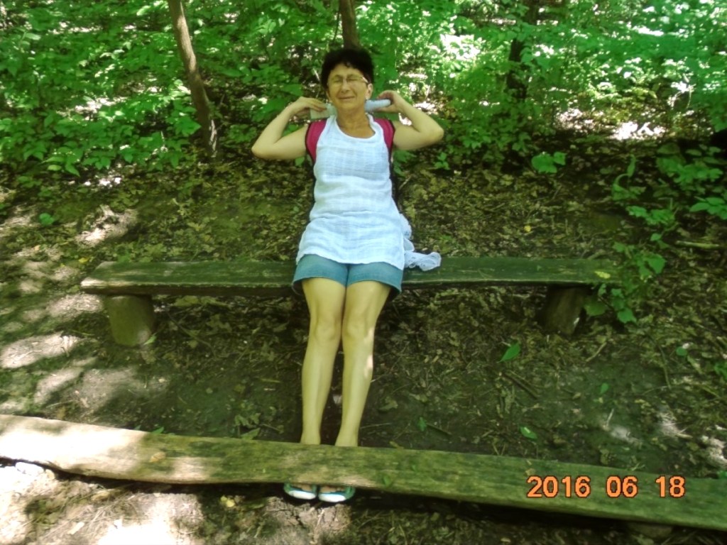 Hiába no, berozsdásodtak azok a ritkán használt izmok! De lehet hogy csak a hátizsák nehéz, melyet Vé nem akar letenni, egyetemben a kinyomtatott ládaoldalt tartalmazó papírlappal. Több, törzshajlításra biztató állomás után, eljutunk a törzsdöntésig. Itt Vé-nek már van annyi ereje, hogy rólam is készítsen egy képet, mert a gyakorlatokat természetesen én is csinálom rendesen. Persze a gyakorlat közbeni hátizsákviselés hagyományáról én sem mondok le. Ez már olyan védjegyünk lesz!
