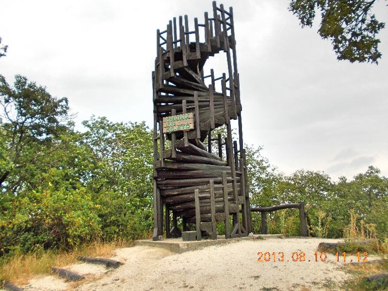 Leszállás után aggódva kémleljük az eget, lesz-e eső, mert a környéken csúnya fellegek kezdtek gyülekezni. Bízva jó szerencsénkben, nekivágunk a Vadaskerti utcának, mely a meredek Lipótmezei útban folytatódik, amit még lépcsőkkel is fűszereztek. Megcsodáljuk kívülről a “Lipótmező” kastélyát és kertjét. Valamikor szép lehetett, de most inkább a lepusztultság jelei látszanak rajta. Persze, el akarják adni, senki nem törődik már a karbantartással! Az utca vége egy fák között húzódó gyalogútba torkollik. Innentől erdei környezetben megyünk. Tipikus kultúrpark övezet, széles, kaviccsal borított utak hálózata. Még “utcanevet” is kapott az útvonal, Hárshegyi körút néven. Keresztezzük a Gyermekvasút nyomvonalát. Vonat sehol, pedig szeretem megcsodálni, ahogy elcsattog előttem. Innen komolyabb emelkedő kezdődik, mely a kilátóig tart. Lihegve érek fel. A fellegek egyre komorabbak és feltámadt a szél, mely távolról égzengés hangját hozza felénk. Gyorsan, menjünk fel és nézzünk szét, mielőtt ideér a vihar!- javaslom. Így is teszünk. A kilátás gyönyörű, bár a környező hegycsúcsokat itt-ott már felhő takarja el és átcikázik rajtuk a villámok fénye. A kilátó a nagy szélben úgy imbolyog, mintha hajón lennénk. Szaporán körbefotózzuk a tájat, majd iszkolunk lefelé, mert a dörgés már közeli villámokat jelez. Márpedig az Álmoskönyv szerint nem okos dolog villámlás közepette kilátón, pláne nem ilyen fémcső központtal épült kilátón tartózkodni. Miután leérünk még néhány fénykép magáról a műtárgyról. Közben megállapítom, hogy lehet ez a kilátó szép és egyedi az egymásba fonódó kettős csigalépcsővel, de funkcionálisan elég gyenge, mert nagyon instabil. Úgy látszik, egy Makovecz is hibázhat! Indulunk a ládát megkeresni. Ahogy beérünk a fák közé, megérkezik az eső is. Egyenletesen kopog a leveleken. Szerencsére a lombozat sűrű, elég jól megszűri az esőt. A láda gyorsan előkerül, gyors logolás, majd rövidesen ismét a séta úton vagyunk. Felöltöm az esőkabátom, Kata persze semmit sem hozott eső ellen. Fázunk, különösen Kata, mert a csapadék hideg széllel társul. Jókat röhögünk egymáson, főleg az én szexi öltözékemen, fényképezkedünk