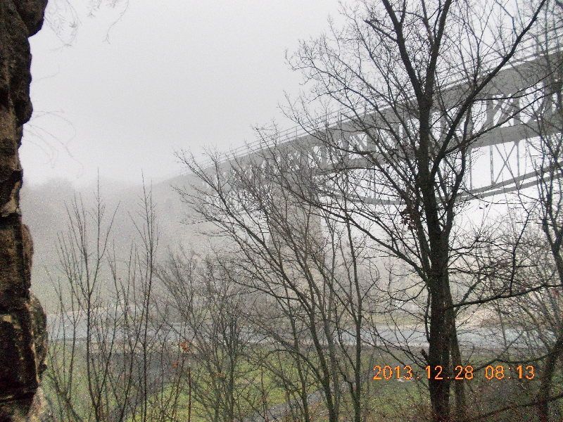 Logolunk, majd kicsit nézelődünk és fényképezünk. Közben figyeljük a köd gomolygását. A viadukt hol feltűnik, hol eltűnik.