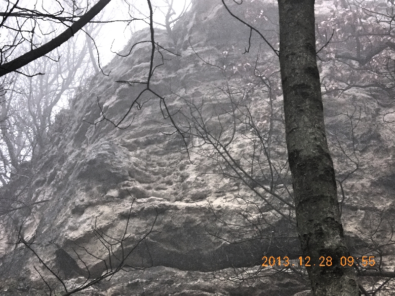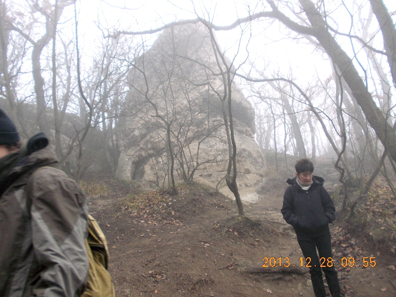 Miután a láda után Vé-t is sikeresen megtaláljuk a viadukt aljában, tovább indulunk. A hegyeket célozzuk meg, hogy azokon átkelve jussunk el az Érd melletti Geokarácsonyfához. Az útba eső Hármas-szikla ládát fogjuk még utunk során megkeresni. Eleinte sima aszfaltúton megyünk egyre vidámabban, ahogy a nyomasztó hatású viaduktot magunk mögött hagyjuk. Kíváncsi vagyok, hogy napos időben is ilyen hangulatú-e ez a hely. Majd kiderül, hisz fogunk még erre járni, ebben biztos vagyok, mert a környéken sok láda van. A Madár-forrás környékén aztán megszűnik az aszfalt és ráfordulunk a hegyre vezető útnak. Az út eleinte szépen illedelmesen, azaz enyhén emelkedik. A turistaút kikerül egy magánterületet. A nyomvonalból látszik, hogy hajdan itt egyenesen lehetett menni. Most két kapu meg egy kerítés miatt meg kell kerülni a területet. Hány ilyen van az országban!? Kerülő után visszatérünk az eredeti nyomvonalra és a terep is durcásabbra vált, azaz a szelíd emelkedő meredekebbe megy át. Na, ez még viselhető! Ballagunk a különös hangulatú ködös erdőben. Kicsit deja vu érzés. Egy tavalyi börzsönyi túrára emlékeztet, amit szintén hármasban tettünk meg. Az emelkedő aztán egészen meredekre vált, én meg teljesen kikészülök. A nagyon meredek máskor sem tartozik a kedvenceim közzé, de most ebben a szinte folyékony levegőben, beteg tüdőm alig-alig tud oxigént juttatni a vérembe. Nem segít sem az asztma pipa, sem a rohamoldó. Rég voltam ilyen pocsék állapotban! Még a család szemében is aggodalmat látok, pedig ők megszokták a “haldoklásomat”. Aztán szép lassan, fától fáig osonva, csak felérünk a Kő-hegyre. A hegy ormán haladunk. Több helyen is remek kilátás nyílna az alant elterülő völgyre, de a sűrű köd miatt, csak a közeli fák csupasz ágaiban, no meg az örökzöld fenyőkben gyönyörködhetünk. Szintben haladva elérünk a következő ládához, mely a Hármas-szikla névre hallgat. Nézegetem a TuHu térképet, de itt a közelben Négyes-Sziklát jelöl a térkép. A Hármas-Szikla még odább van. Nem baj! Megkeressük a ládát. Elhelyezzük benne a szokásos karácsonyfadíszt, melyet adventtől az év végéig szoktunk ajándék gyanánt a ládákban hagyni és logolunk. Majd nézzük a “panorámát”. A ládaoldalon remek, jó idős képek vannak. Olyankor látni lehet előző helyszínünket, a viaduktot is. Most azonban csak a köd mindenfele. Viccesen mondom a többieknek, hogy mindenki azt képzel el látványnak, amit akar. A hormonoktól teli, kamaszkorú fiam rögtön közli is, hogy Ő bizony meztelen Tesco-s lányokat lát, akik éppen fürdeni készülnek. Hogy ez honnan jött neki? Na persze, álmodik a nyomor. Már bármilyen pucér lányka jól jönne, csak jönne! Majd eljön annak is az ideje! Vé a nyíló virágokkal teli, tavaszi erdőt látja, én meg örülök, hogy végre már nem látok csillagokat a ködös égbolton, mert kezd helyreállni a légzésem. Miután mindenki kiélte a fantáziáját, megyünk tovább. Megkerüljük az igazi Hármas-sziklát és “egy emelettel” lejjebb megyünk tovább.