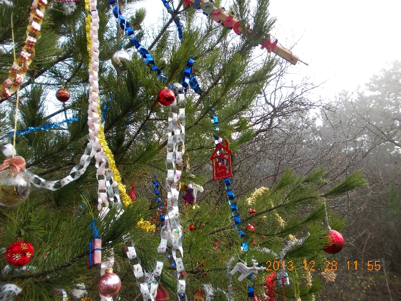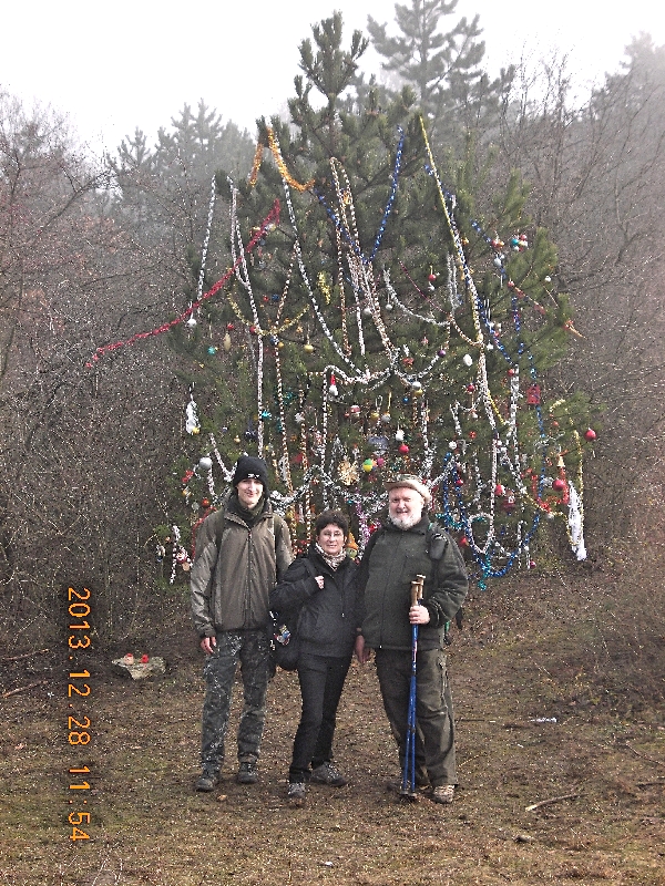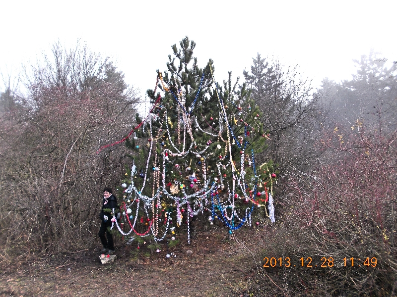 Az út először meredeken ereszkedik, amitől viszont Vé visít, mert az ő lába meg a lejtőt nem szereti. Jól kiegészítjük egymást. Persze a számomra jutalom ereszkedés után, hasonlóan meredek emelkedő következik ismét. Egy ponton olyan sáros, hogy alig tudunk felkapaszkodni. Én el is csúszok, így szép sárfolttal az “ünnepi” túraruhámon megyek tovább a Geokarácsonyfához. Remélem nem köveznek meg érte, itt az erdőben! Mikor felküzdöm magam az emelkedő tetejére, Zoli közli, hogy Ő látta, hogy a turistaút oldalazva, kissé balra megy fel ezen a meredeken. Letolom, miért nem szólt. Állítólag mondta, de én nem hallottam. Szerintem megint a meztelen lányokon járt az esze. Mindegy. Az út ismét simábbra vált. Ekkor azonban, az erdő közepén egy villanypásztor vezetéke keresztezi a turistautat. Számomra az ilyen szerkezet magánterületet jelöl, de kerülő út nincs. Egyébként az út mellett, a villanypásztor bonthatóan van kialakítva, így leakasztjuk és megyünk tovább. Vajon mit védenek itt vele? Vagy azért van, hogy a vadak el ne szökjenek a területről? Úgy mégiscsak könnyebb levadászni őket. A másik sarkon már rutinosan akasztjuk ki a kerítést és megyünk tovább. Lassanként elérünk egy makadám útra, majd ismét szekérúton vezet az utunk. Itt már tempósabban haladunk, mert igen csekély a szintkülönbség. Rövidesen parkoló autók tűnnek fel, azt hiszem megérkeztünk. Valóban egy rövidke emelkedő után ott áll előttünk a FA! Varázslatos látvány az erdőben, a feldíszített fenyő, alig hiszünk a szemünknek. Sokan fényképezkednek és sétálgatnak körülötte. Köszöntjük az ott lévőket. Mintegy varázsütésre, a ködön áttör a nap fénye, még szebbé és csillogóbbá téve a feldíszített fát.