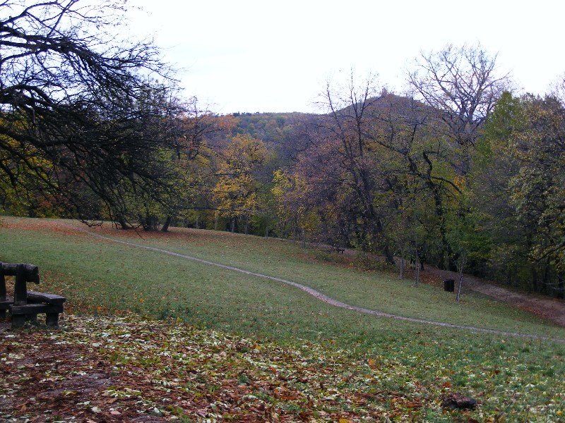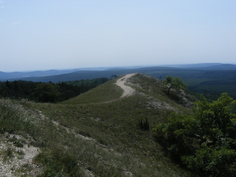 Nézelődés után az ismert úton indulok vissza. A hegy alatti turistaút csomóponthoz érve, úgy döntök, hogy a változatosság kedvéért a úton, a Bence-hegy lába mellett térek vissza a vasúti megállóhelyhez. Innen remek kilátás nyílik a Meleg-hegyre. Elcsodálkozom, hogy milyen magasan és milyen messze jártam.