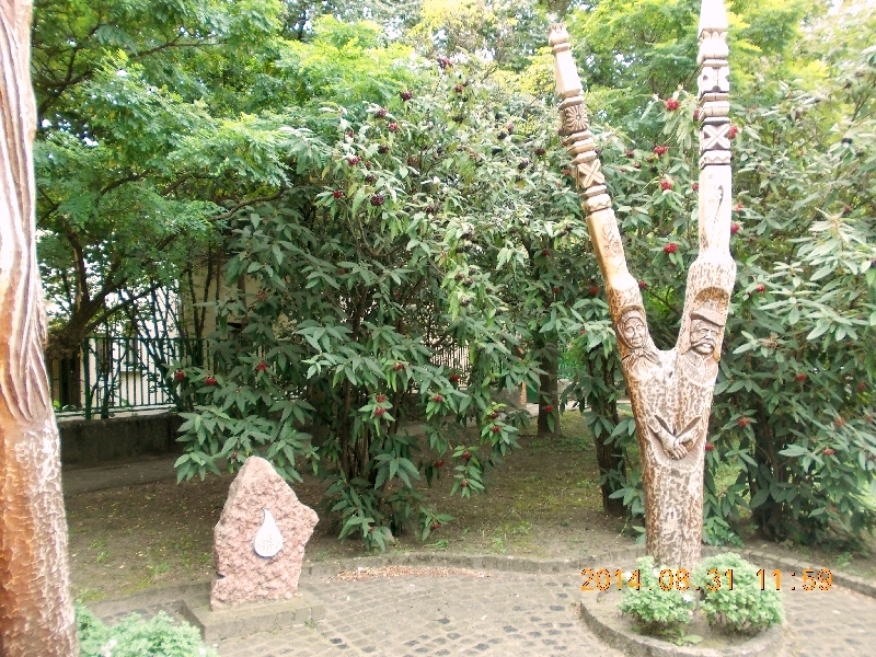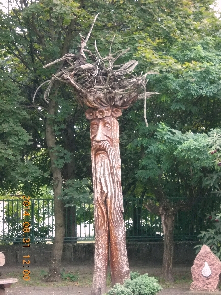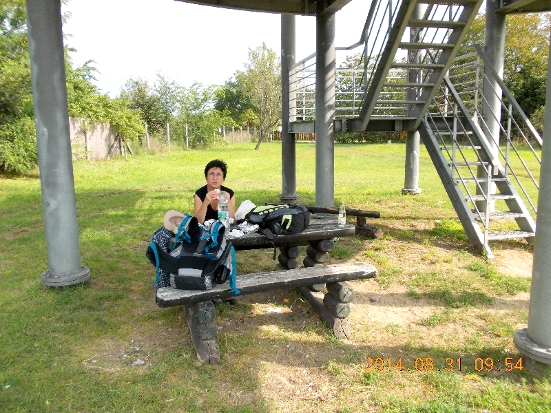 Míg felmászom, kissé “hangyás” leszek, Vé söprögeti rólam, amit talál. Logolás után gyorsan visszarejtem, eltávolítjuk az újabb hangyákat és indulunk a település központja felé. A tó nem nagyon érdekel, bennünket, inkább a település. A hangyák sürgölődése is a közeledő esőre utal. Így is van, alig érünk be a házak közzé, már csepeg is. Halogatjuk a dolgot, hogy ne kelljen a zsákból az esőkabátot előhalászni, de egyre komolyabban esik. Nincs választás! Felvesszük poncsóinkat, de mire végzünk vele, már el is áll. Ez igen rövid zápor volt, leginkább szívatás jelleggel. Kabalából magunkon hagyjuk az esővédőket, de mire a település központjába érünk, már nagyon meleg van alatta, így levesszük. Szerencsére az esőfelhő elhúzódott.