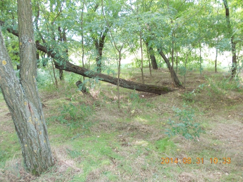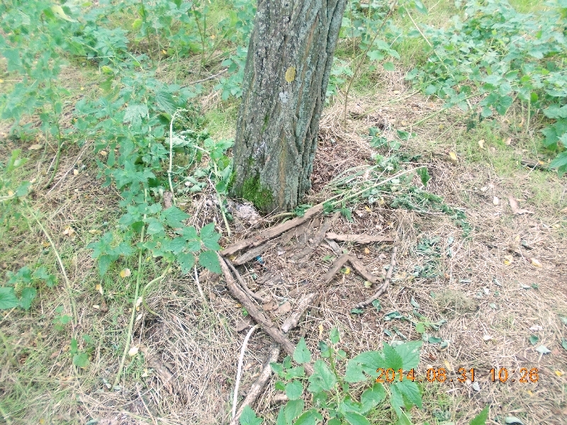 jelzésen folytatjuk. Az út egyik oldalán a megszokott szőlőskertek, a másikon kezdődik az erdő. Néhány kanyar után meg is érkezünk a rejtési helyre. A logokból látszik, hogy nem teljesen egyértelmű a leírás, a ládát többen nem találták meg. Ezért is hívtam fel Osi barátomat, hogy megkérdezzem a részletekről, mert Ő nem régiben járt erre. A ládának egy megdőlt fa alatt kellene lennie, de ehelyett egy álló fa tövében leljük meg, gallyakkal és száraz fűvel álcázva. Az eltérés pár méter, tulajdonképpen belefér a GPS hiba határába. Ha nem ragaszkodunk a leíráshoz, megtalálható.