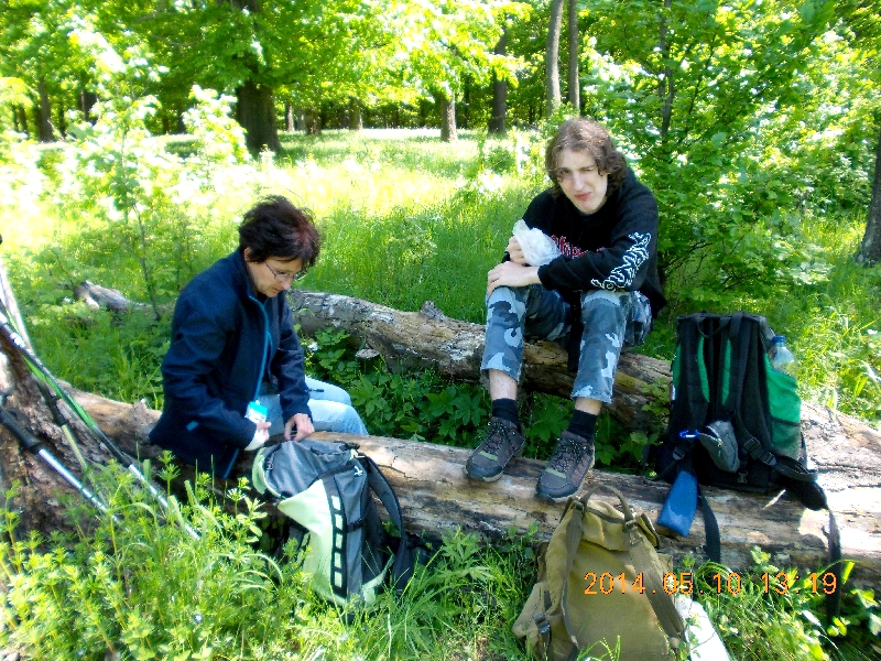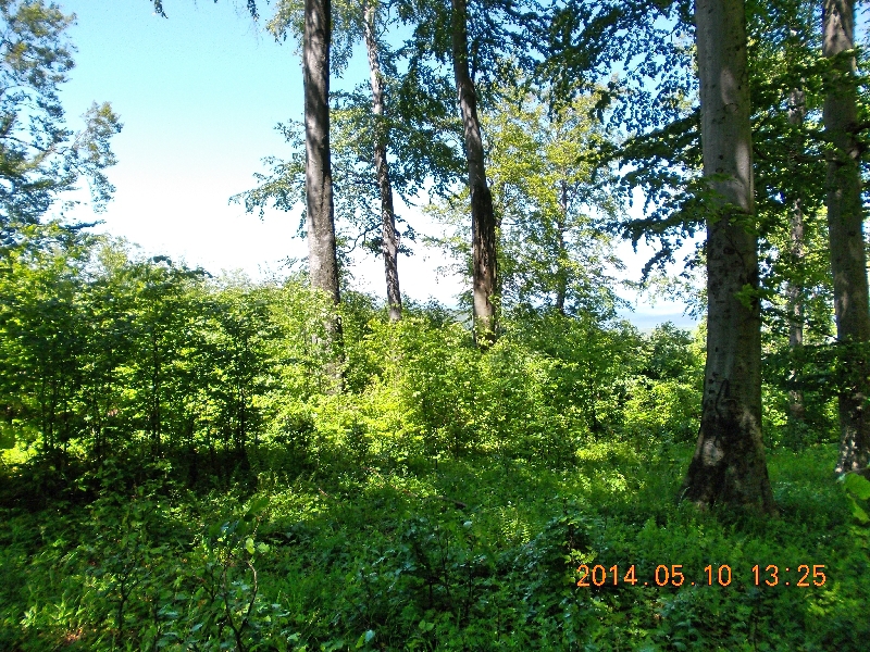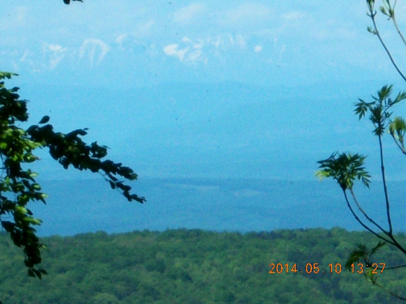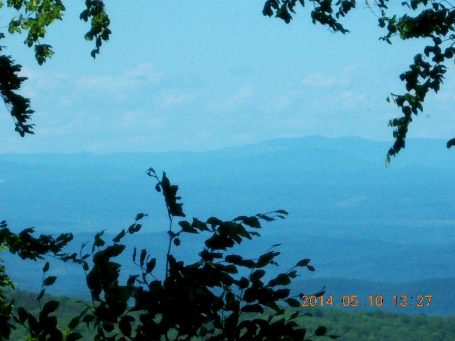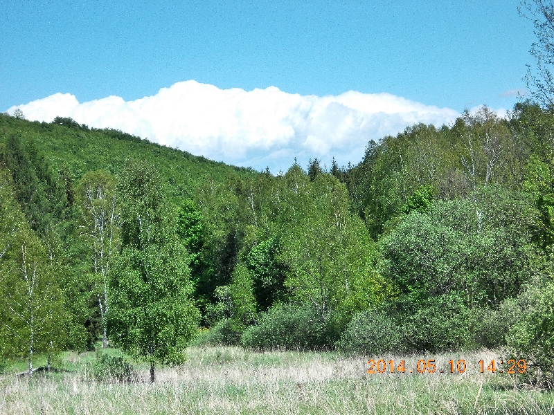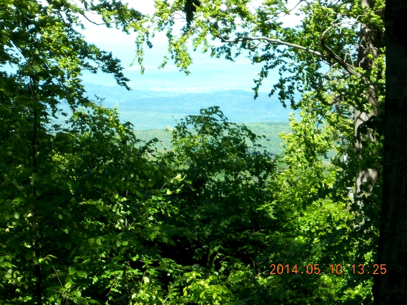 Kaja után elsétálunk a bérc szélére és a fák koronájában képződött réseken át mi is megpróbáljuk meglesni a Magas-Tátrát. Annak ellenére, hogy egy hidegfront után és egy másik előtt vagyunk, amikor is jóval kisebb a levegő páratartalma, nem igazán tökéletes a távoli látvány. A közeli és távolabbi hegyek még csak látszanak is, de dilemmánk támad, hogy a távolban a havas Tátrát vagy csak gomolyfelhőket látunk. Mindkét variáció esélyes, bár a fényképek alapján inkább a felhőkre szavazok.