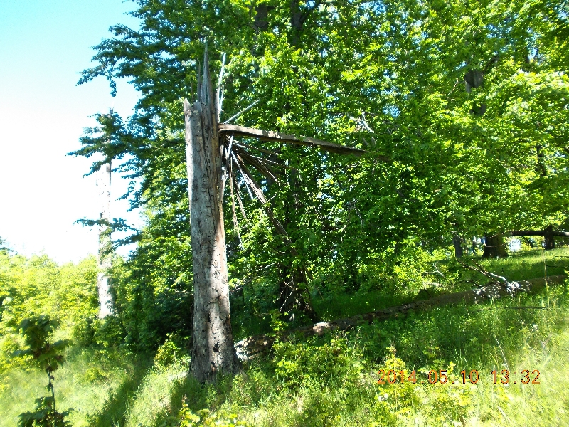 Tehát leszállva az autóbuszról, a végállomásnál induló Sárga sáv jelzésen vágunk neki a hegynek. Meglehetősen erős szél fúj. A hatalmas bükkök koronáiban recsegnek-ropognak az ágak. A szél orgonamuzsikája mellé dobpergésként hat, ahogyan össze-össze ütődnek. Érdekes erdei koncert! Egy idő után Vé elvonul tőlünk, hogy leguggolva engedjen a természet hívásának és elvégezze folyó ügyeit. A munka dandárjában egyszer csak hatalmas reccsenés hallatszik, majd egy óriási ág esik le Vé mögött. Szegénykém, úgy megijedt, hogy majdnem elfelejtette visszahúzni a bugyiját, úgy rohan hozzánk. Isteni szerencse, hogy nem rá esett az ág, mert ehetnénk Zolival ketten a vagdalthús konzervet! (Szerencsére Vé a hátizsákját ideadta, mielőtt elment a dolgára ) Életem párjainak, valahogy nincs szerencséje ezekkel a fákkal. Az első feleségemre a Zemplénben dőlt majdnem egy bükkfa, miközben hasonló tevékenységet végzett. Miután konstatáltuk, hogy Vé-nek az ijedtségen kívül semmi baja sem esett, el is határozzuk, hogy ezentúl erős szélben nem megyünk az erdőbe. Megértettük a figyelmeztetést. Az ösvényen egyébként rengeteg letört faág van, helyenként közlekedni sem könnyű. Az elmúlt napok szeles időjárása megtette a magáét. Megyünk felfelé az erdőben a Vesszős-völgyben. Köröttünk és előttünk meredek hegyoldalak, hatalmas bükkökkel borítva. Nagyon szeretem a bükköt és a bükköst, de most az előző eset után, minden reccsenésre felfelé lesek, hogy érkezik-e újabb “küldemény”. Végre felérünk a platóra, ahol jelzést váltunk. A továbbiakban a Piros kereszt-t követjük. Ha az erdőben a sok letört faág jelezte az elmúlt viharokat, akkor itt a platón már a kidőlt és derékba tört fák sora mutatja, hogy viharos időben nem jó erre járni. Megdöbbenve nézünk egy-egy fát, melynek törzsvastagsága az enyémmel vetekszik és gyufaszálként roppantak meg a szélben. A bükkök, köszönhetően annak, hogy gyökérzetük inkább tányérszerűen a földfelszínen terül szét és nem nyúlik nagyon mélyre, jobbára csak kidőltek, de a tölgyek, melyek gyökérzete mélyebben és erősebben kapaszkodik a földbe, a szél csavaró hatására, szilánkos csonkokként meredeznek az ég felé. Ijesztően szép bizonyítékai a Természet erejének.