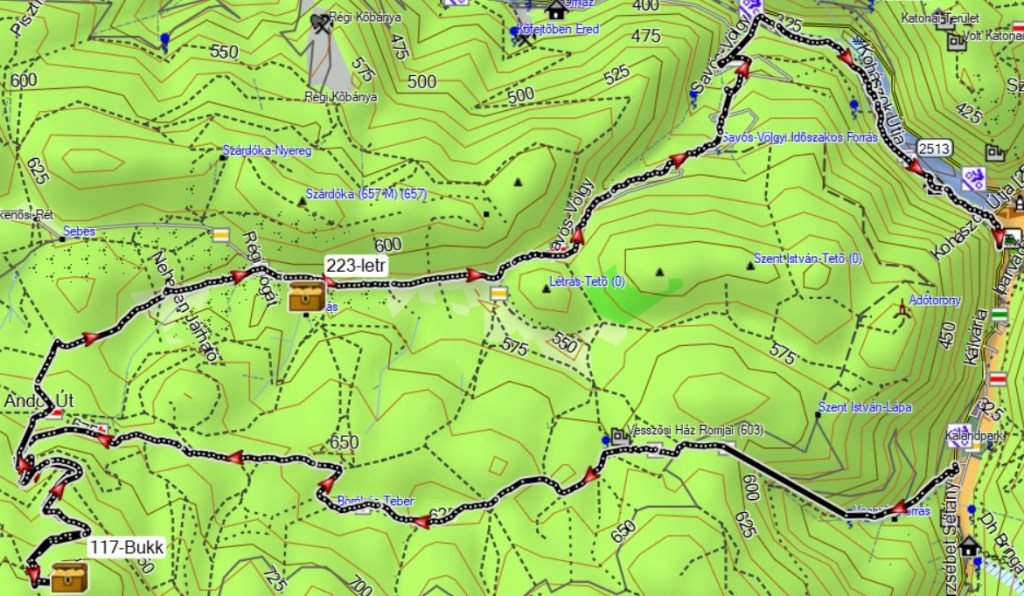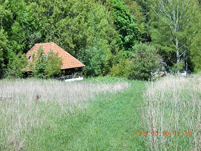 A láda megtalálása és logolása után megkezdjük ereszkedésünket a bércről. A már ismert szerpentinen leereszkedünk a Kühne Andor-útra (Piros sáv jelzés) és a továbbiakban ezen megyünk tovább. Szelíd lejtőn érjük el a Létrástetői kutatóházat, mely a Bükki Nemzeti Park kezelésében működik. A ház mellé épült esőház padjai és asztalai mellett végre kényelmesen letelepedhetünk, hogy elfogyasszuk a konzervünket is. Közben gyönyörködünk az előttünk elterülő tájban. A szél alábbhagyott, így szép gomolyfelhők is tarkítják már az eget.