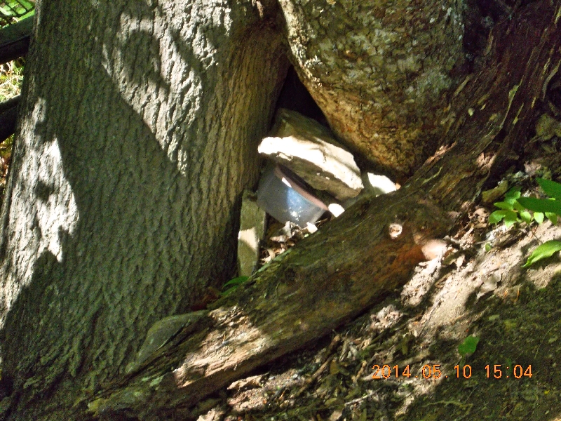 A lejt-viszonyok sem a legjobbak, a meredek lejtőn nem könnyű megállni. Ahogy megfordulok, velem szemben, fejmagasságban szinte kivilágít a láda fehér műanyag teste egy fa gyökerei közül.