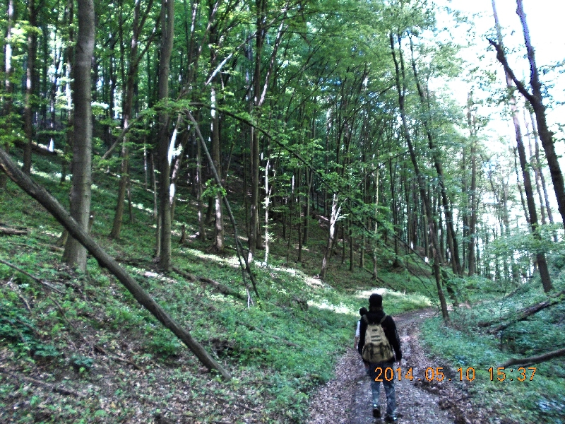 Autó nem nagyon jár erre, így biztonságban haladunk. A Szepesi-rét sarkánál a turistaút elválik az országúttól, hogy kissé meredekebben ereszkedve érje el a Savós-völgyön át, a kisvasút pályáját keresztezve, a Kohászok útját. Ekkor azonban újabb akadálypálya kezdődik, méghozzá a legnehezebb a mai napon. Mondanom sem kell, hogy kidőlt fák állják utunkat. De, mekkorák! Hármunk együttes derékvastagságánál is vastagabb öreg bükkök fekszenek az úton keresztben. Némelyik alatt át lehet bújni, ez Vé-nek megy a legjobban, lévén Ő a legkisebb. Másokon át kell mászni, ami Zolinak kedvez a hosszú lábai miatt. Én, ha lehet megkerülöm a fákat. Egyik módszer sem kedvező, tekintve a mai napon már teljesített jelentős szintkülönbség miatt remegő lábainkat. A nagy útkeresésben még fényképezni is elfelejtek, pedig remek látvány lett volna. Mindenesetre a kép örökre beleégett a retinámba! Az országút ugyan ott szerpentinezik a közelünkben, de a vége máshol van, jelentős kerülőt okozva. Ezeket a plusz kilométereket nem vállaljuk be. Szerencsére, lejjebb érve megszűnik az út akadálypálya jelleg és egy kényelmes lejtésű völgyben andalogva ereszkedünk tovább.